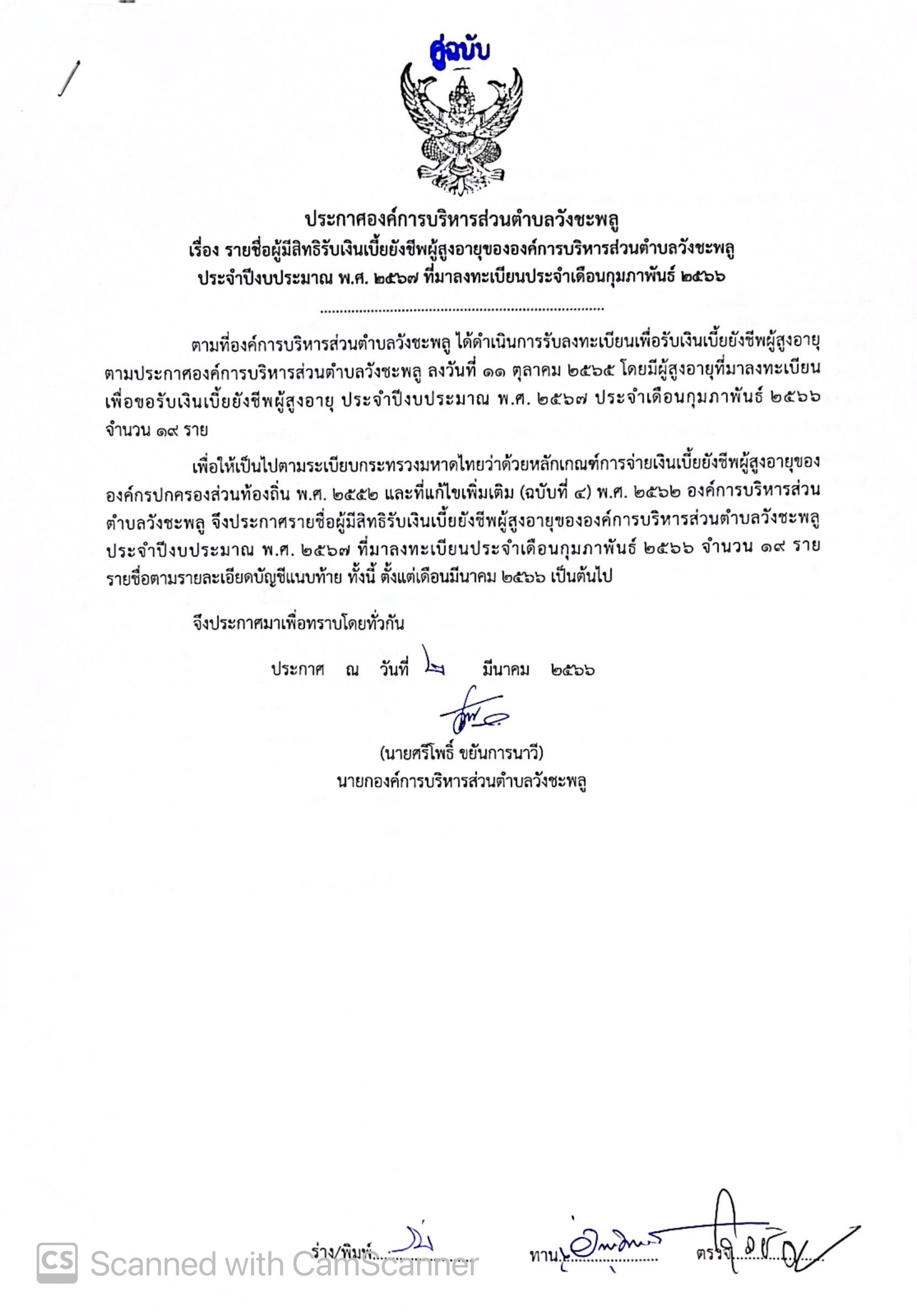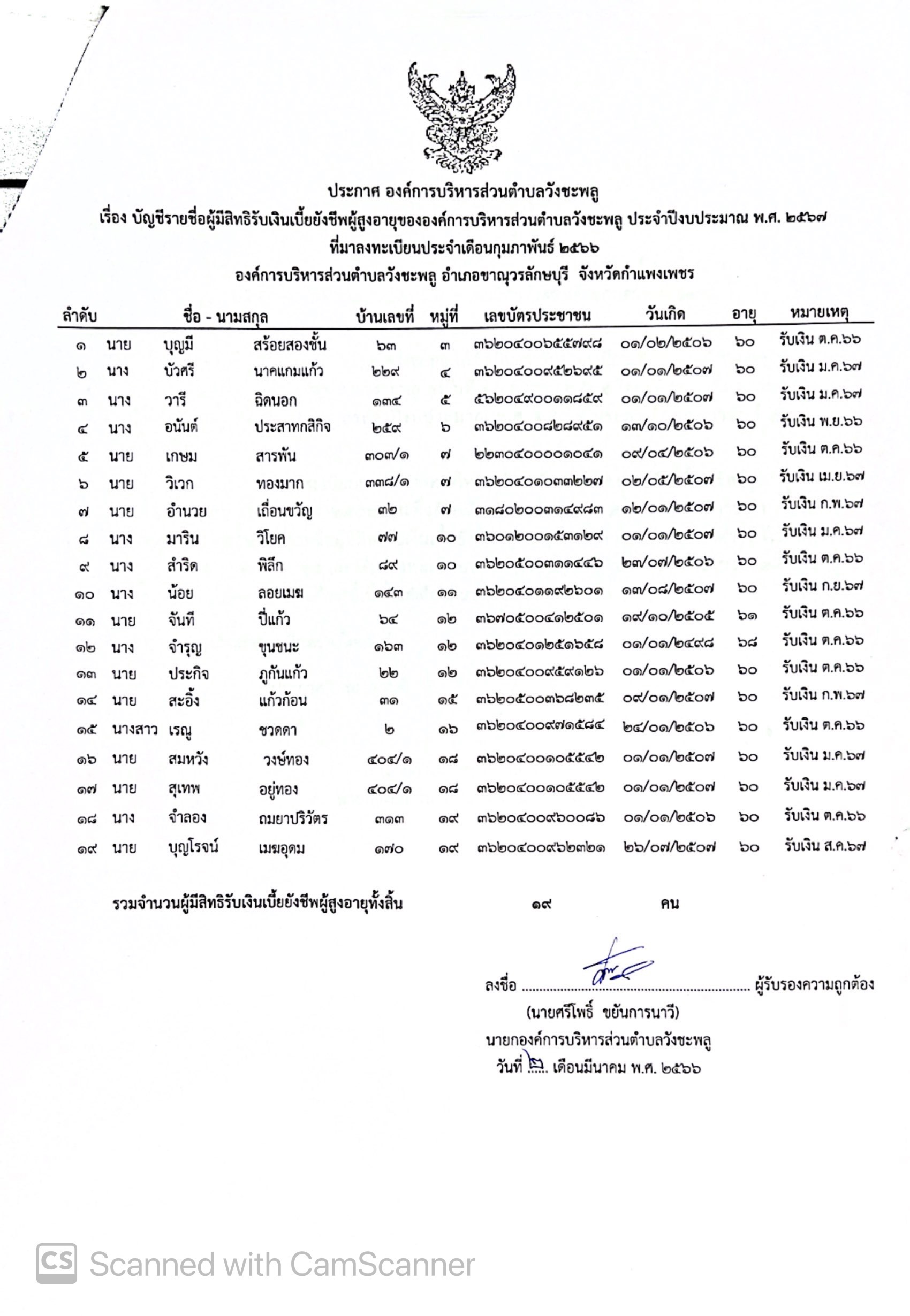รายชื่อผู้มีสิทธิรับเงินเบี้ยยังชีพผู้สูงอายุขององค์การบริหารส่วนตำบลวังชะพลู ประจำปีงบประมาณ พ.ศ. 2567 ที่มาลงทะเบียนประจำเดือนกุมภาพันธ์ 2566