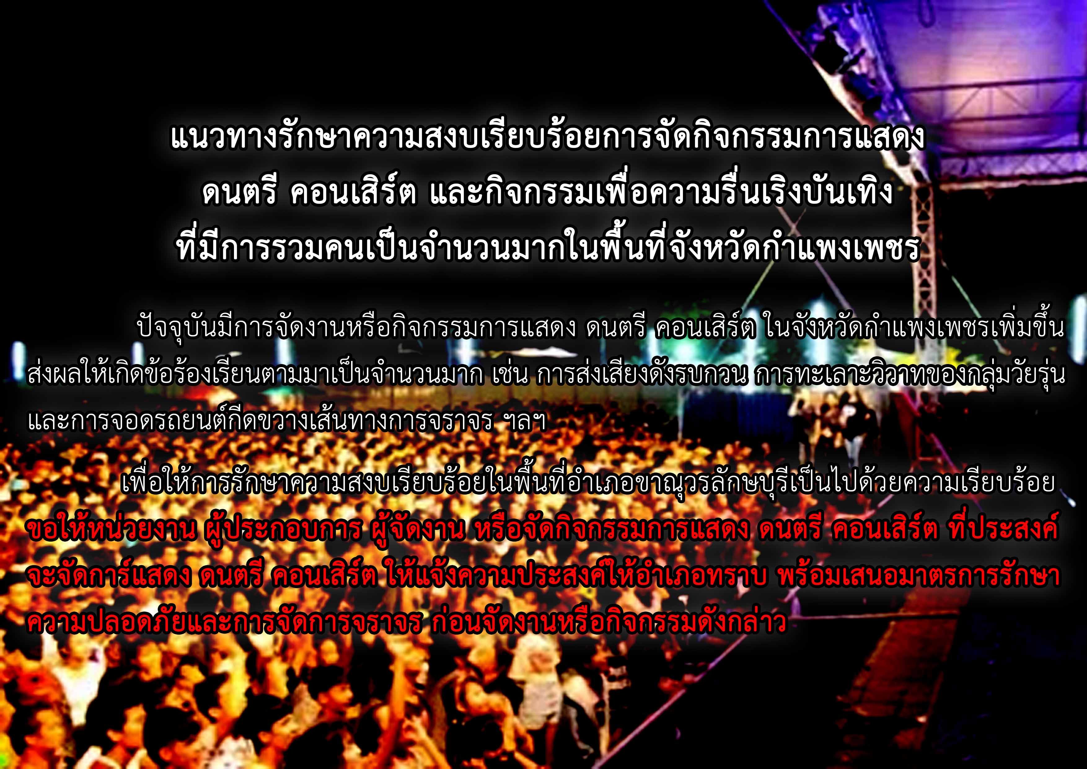 แนวทางรักษาความสงบเรียบร้อยการจัดกิจกรรมการแสดง ดนตรี คอนเสิร์ต และกิจกรรมเพื่อความรื่นเริงบันเทิง ที่มีการรวมคนเป็นจำนวนมากในพื้นที่จังหวัดกำแพงเพชร