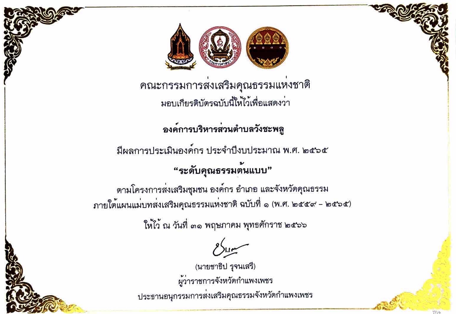 คณะกรรมการส่งเสริมคุณธรรมแห่งชาติ มอบให้องค์การบริหารส่วนตำบลวังชะพลู มีผลการประเมินองค์กร ประจำปีงบประมาณ พ.ศ. 2565 "ระดับคุณธรรมต้นแบบ" ตามโครงการส่งเสริมชุมชน องค์กร อำเภอ และจังหวัดคุณธรรม ภายใต้แผนแม่บทส่งเสริมคุณธรรมแห่งชาติ ฉบับที่ 1 (พ.ศ. 2559-2565) ณ วันที่ 31 พฤษภาคม 2566