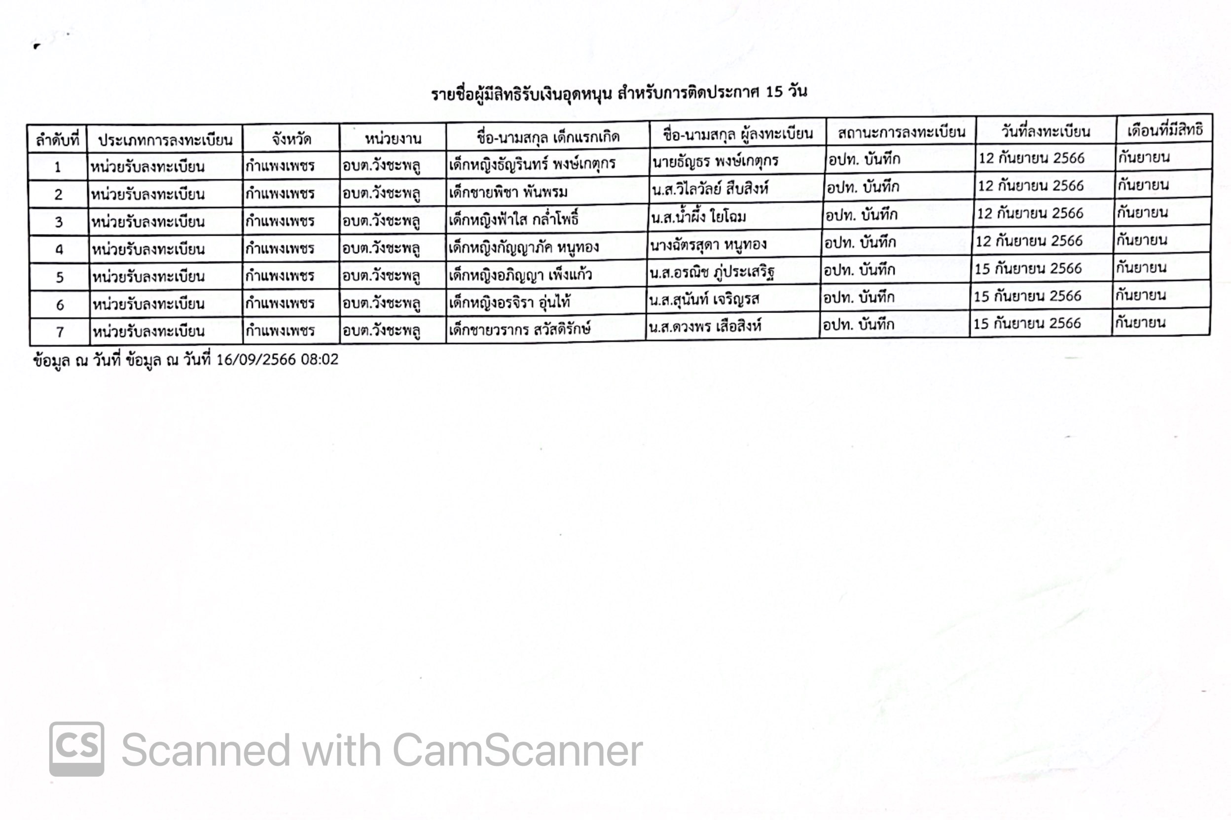ประกาศองค์การบริหารส่วนตำบลวังชะพลู เรื่อง รายชื่อผู้มีสิทธิรับเงินอุดหนุนเพื่อการเลี้ยงดูเด็กแรกเกิด ประจำเดือน กันยายน 2566 ครั้งที่ 1