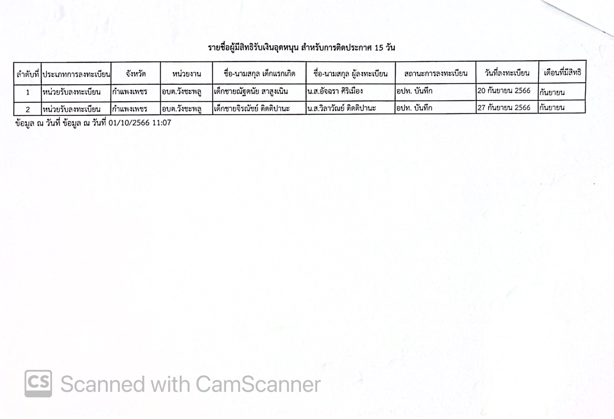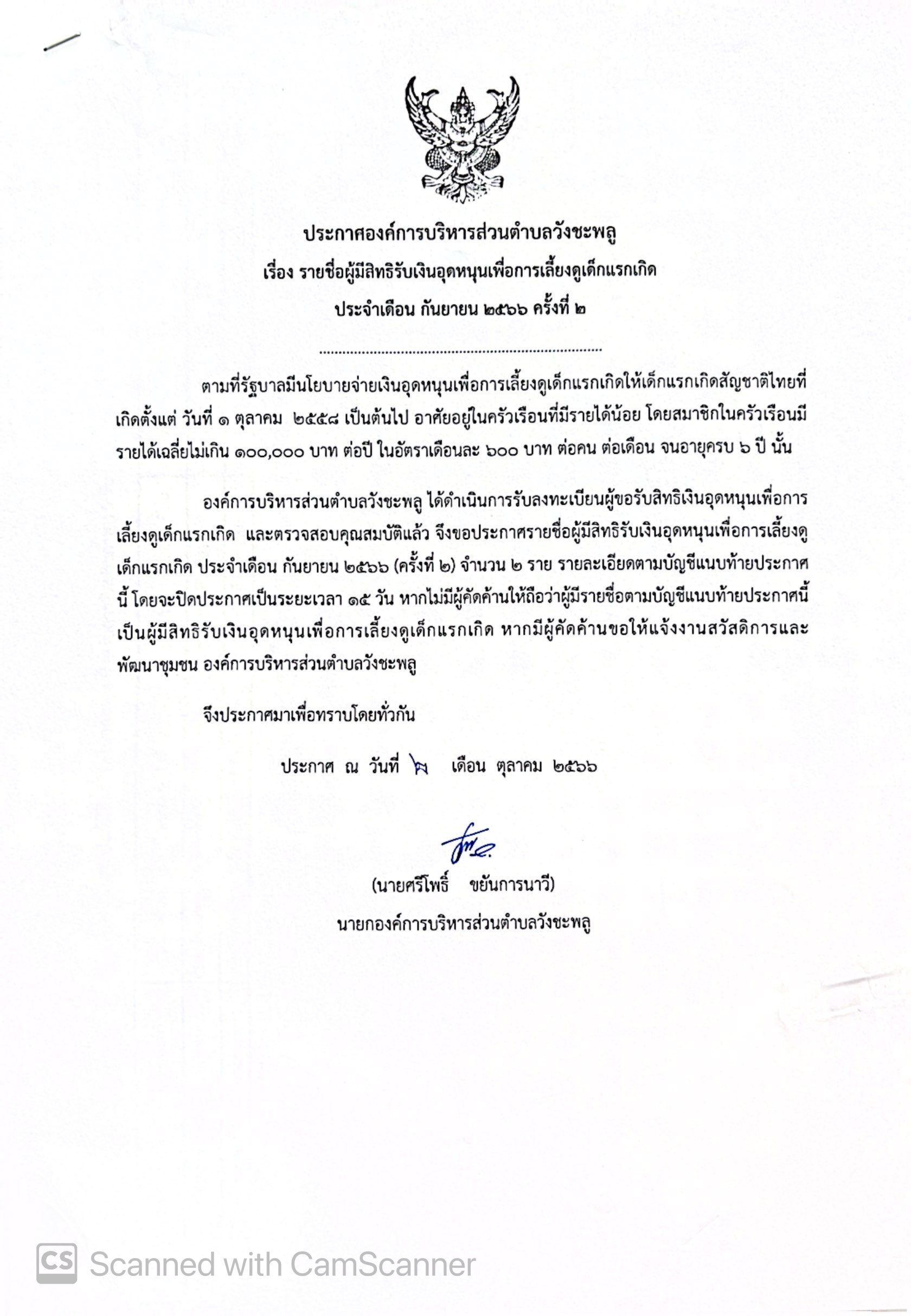 ประกาศองค์การบริหารส่วนตำบลวังชะพลู เรื่อง รายชื่อผู้มีสิทธิรับเงินอุดหนุนเพื่อการเลี้ยงดูเด็กแรกเกิด ประจำเดือน กันยายน 2566 ครั้งที่ 2