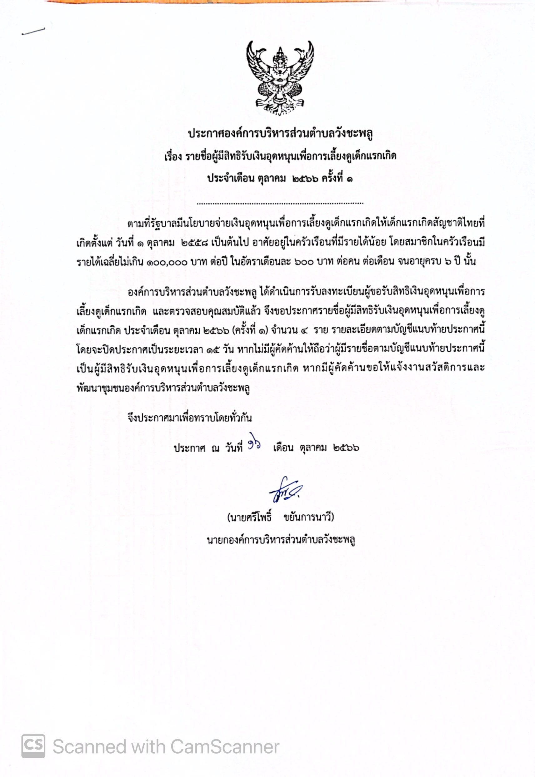 ประกาศองค์การบริหารส่วนตำบลวังชะพลู เรื่อง รายชื่อผู้มีสิทธิรับเงินอุดหนุนเพื่อการเลี้ยงดูเด็กแรกเกิด ประจำเดือนตุลาคม 2566 ครั้งที่ 1