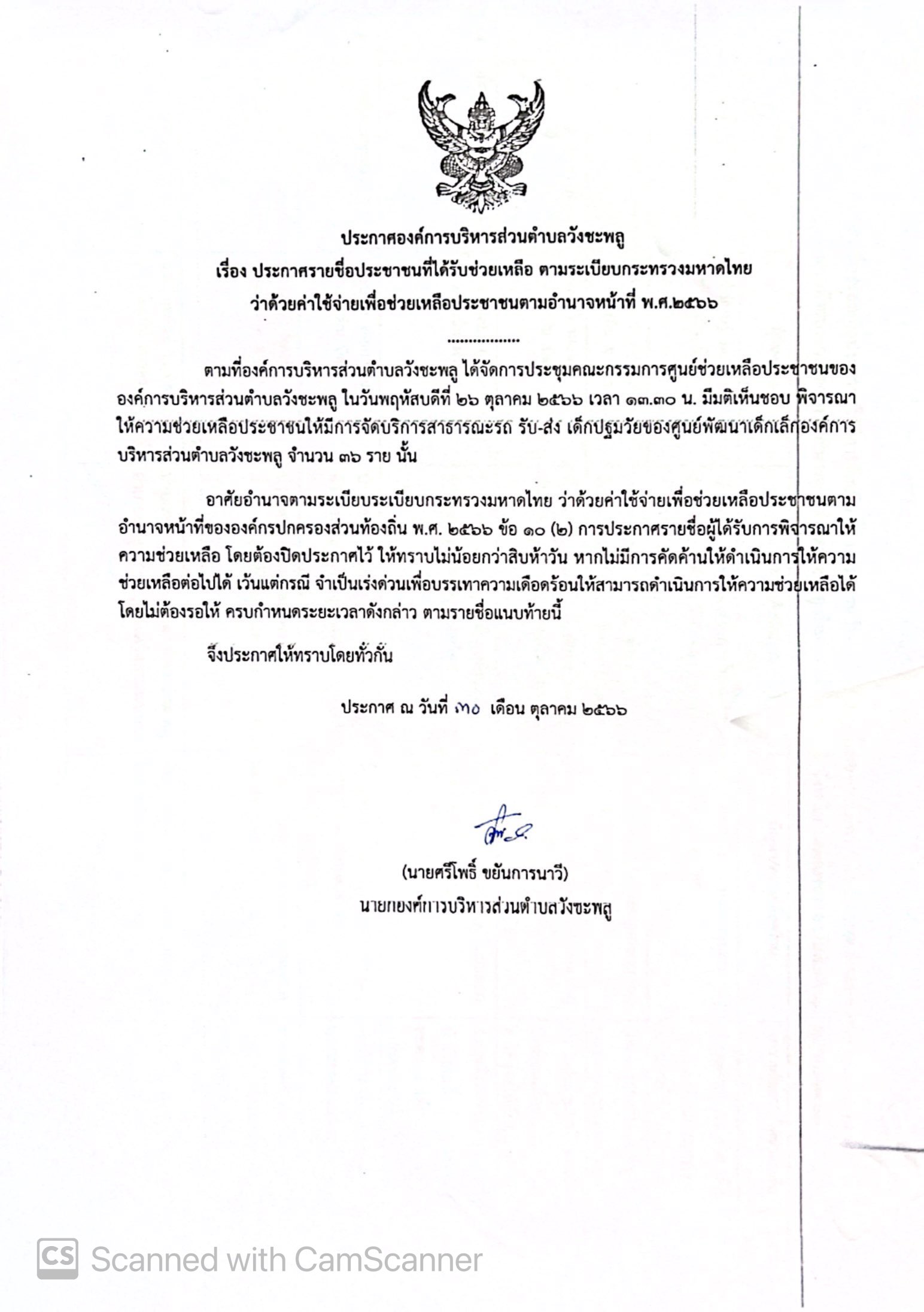 ประกาศองค์การบริหารส่วนตำบลวังชะพลู เรื่อง ประกาศรายชื่อประชาชนที่ได้รับความช่วยเหลือ ตามระเบียบกระทรวงมหาดไทย ว่าด้วยค่าใช้จ่ายเพื่อช่วยเหลือประชาชนตามอำนาจหน้าที่ขององค์กรปกครองส่วนท้องถิ่น พ.ศ. 2566