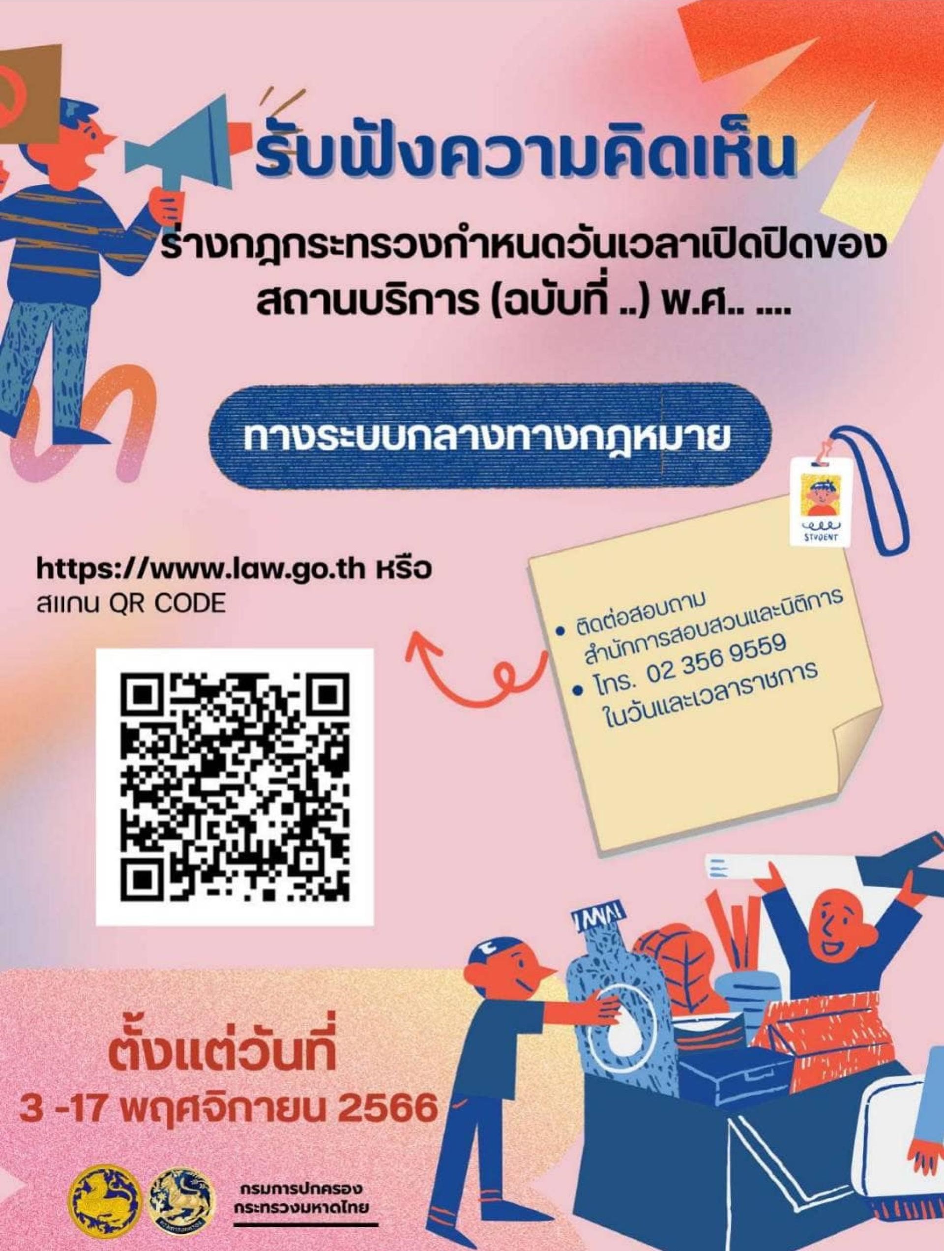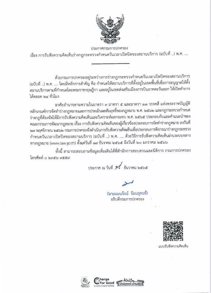 ด้วยกรมการปกครอง ได้มีประกาศ เรื่อง การรับฟังความคิดเห็นร่างกฎกระทรวงกำหนดวันเวลาเปิดปิด