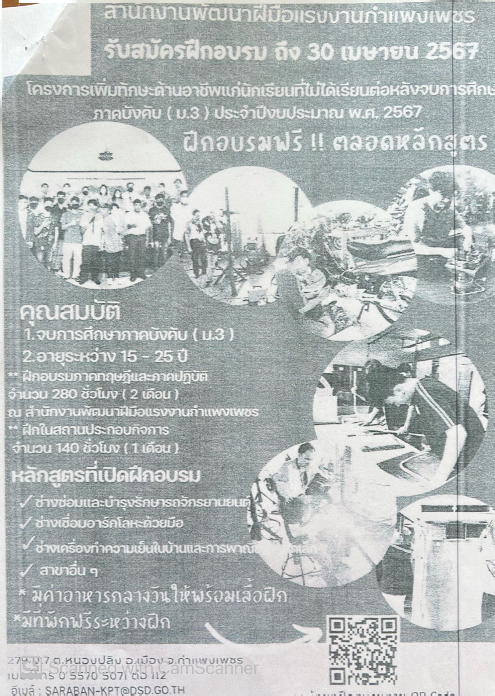 อบรมฟรี ตลอดหลักสูตร หลักสูตรที่เปิดฝึกอบรม -ช่างซ่อมและบำรุงรักษารถจักรยานยนต์ -ช่างเชื่อมอาร์กโลหะด้วยมือ -ช่างเครื่องทำความเย็นในบ้านและการพาณิชย์ขนาดเล็ก -สาขาอื่นๆ