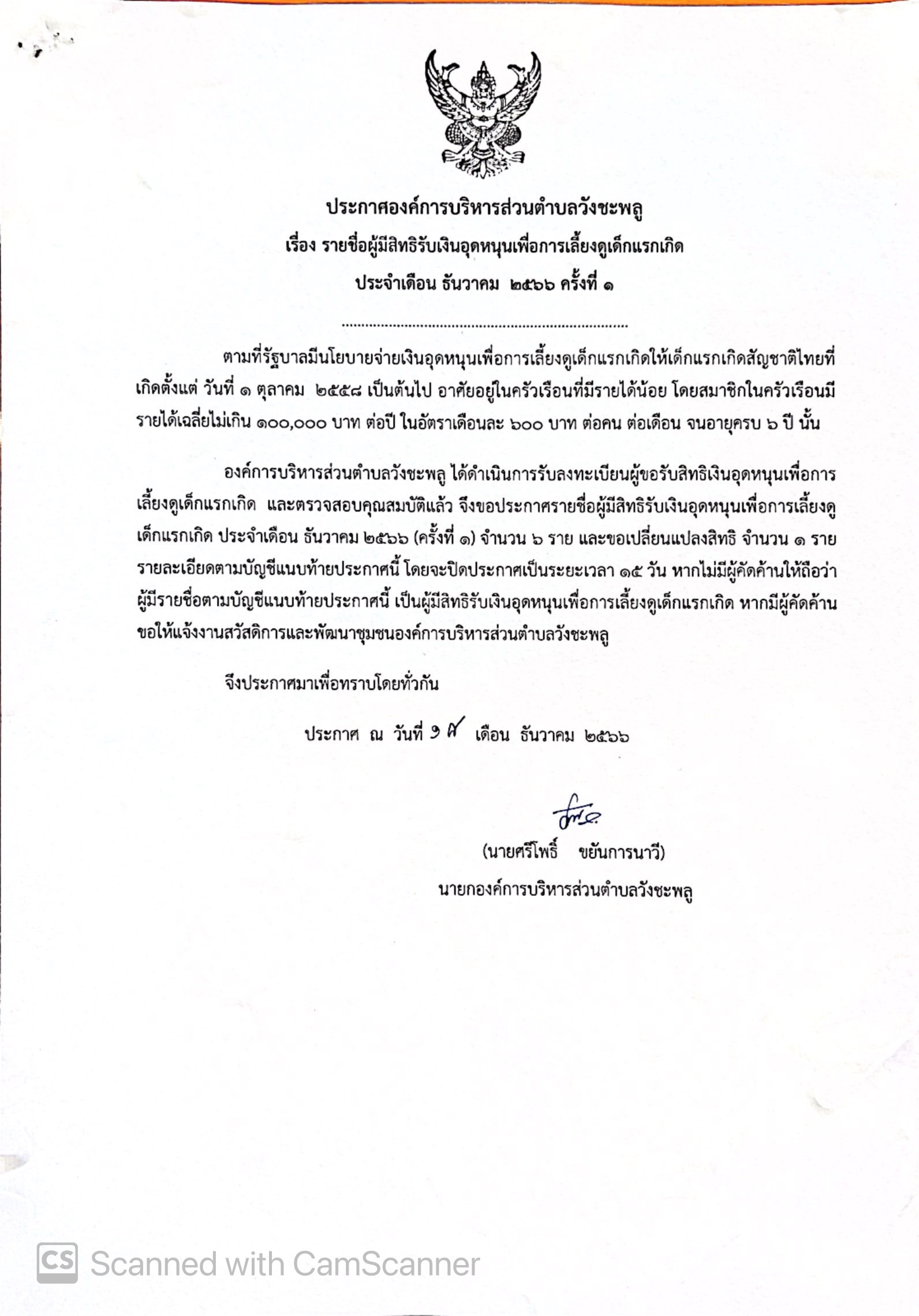 ประกาศองค์การบริหารส่วนตำบลวังชะพลู เรื่อง รายชื่อผู้มีสิทธิรับเงินอุดหนุนเพื่อการเลี้ยงดูเด็กแรกเกิด ประจำเดือน ธันวาคม 2566 ครั้งที่ 1