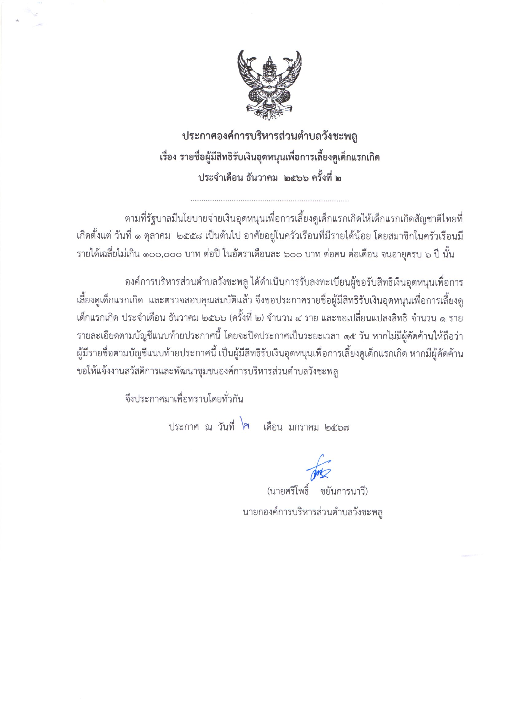 ประกาศองค์การบริหารส่วนตำบลวังชะพลู เรื่อง รายชื่อผู้มีสิทธิรับเงินอุดหนุนเพื่อการเลี้ยงดูเด็กแรกเกิด ประจำเดือน ธันวาคม 2566 ครั้งที่ 2