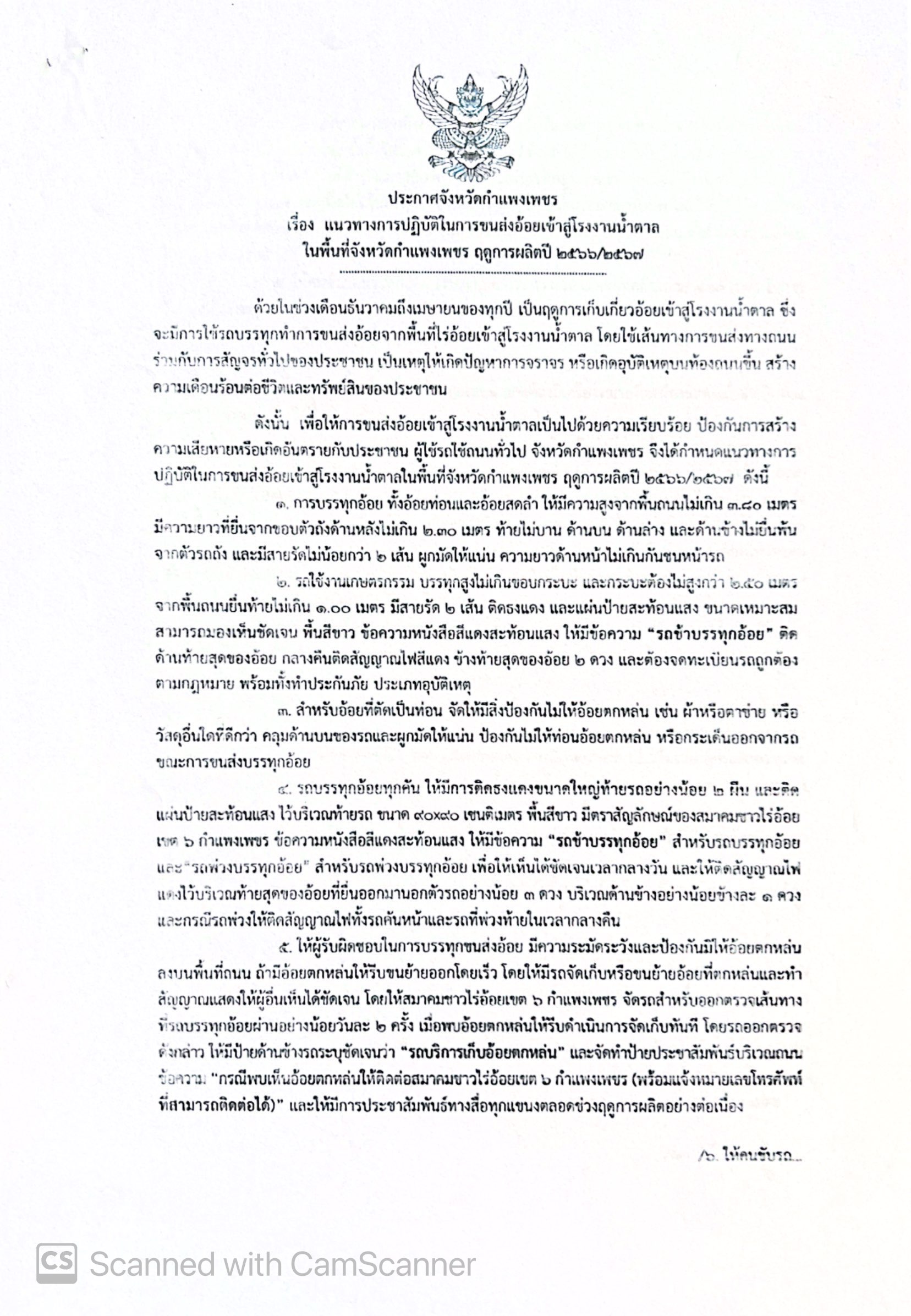 -ประกาศจังหวัดกำแพงเพชร เรื่อง แนวทางปฏิบัติในการขนย้ายอ้อยเข้าสู่โรงงานนํ้าตาลในพื้นที่จังหวัดกำแพงเพชร ฤดูการผลิดต ปี 2566-2567