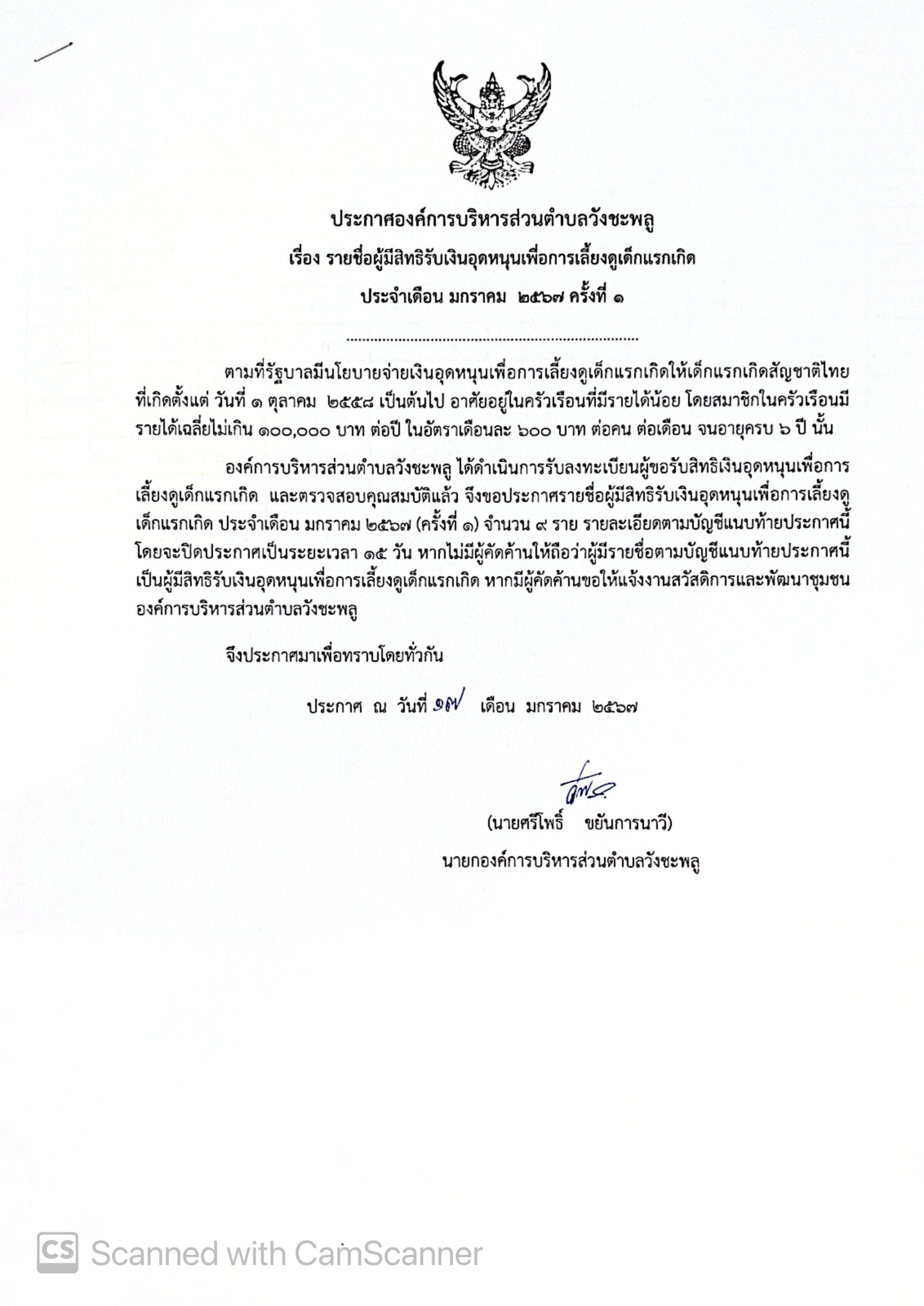 ประกาศองค์การบริหารส่วนตำบลวังชะพลู เรื่อง รายชื่อผู้มีสิทธิรับเงินอุดหนุนเพื่อการเลี้ยงดูเด็กแรกเกิด ประจำเดือน มกราคม 2567 ครั้งที่ 1