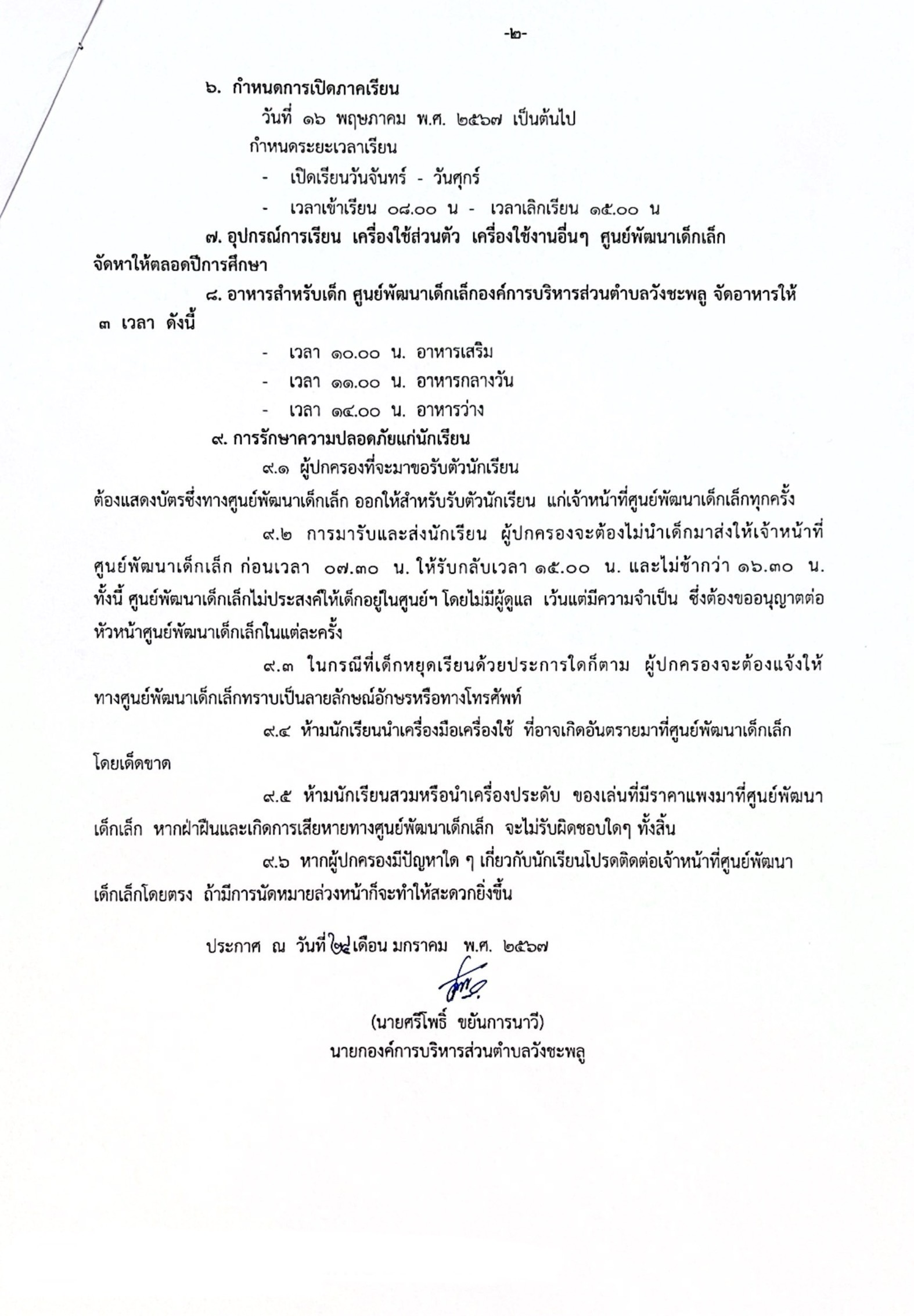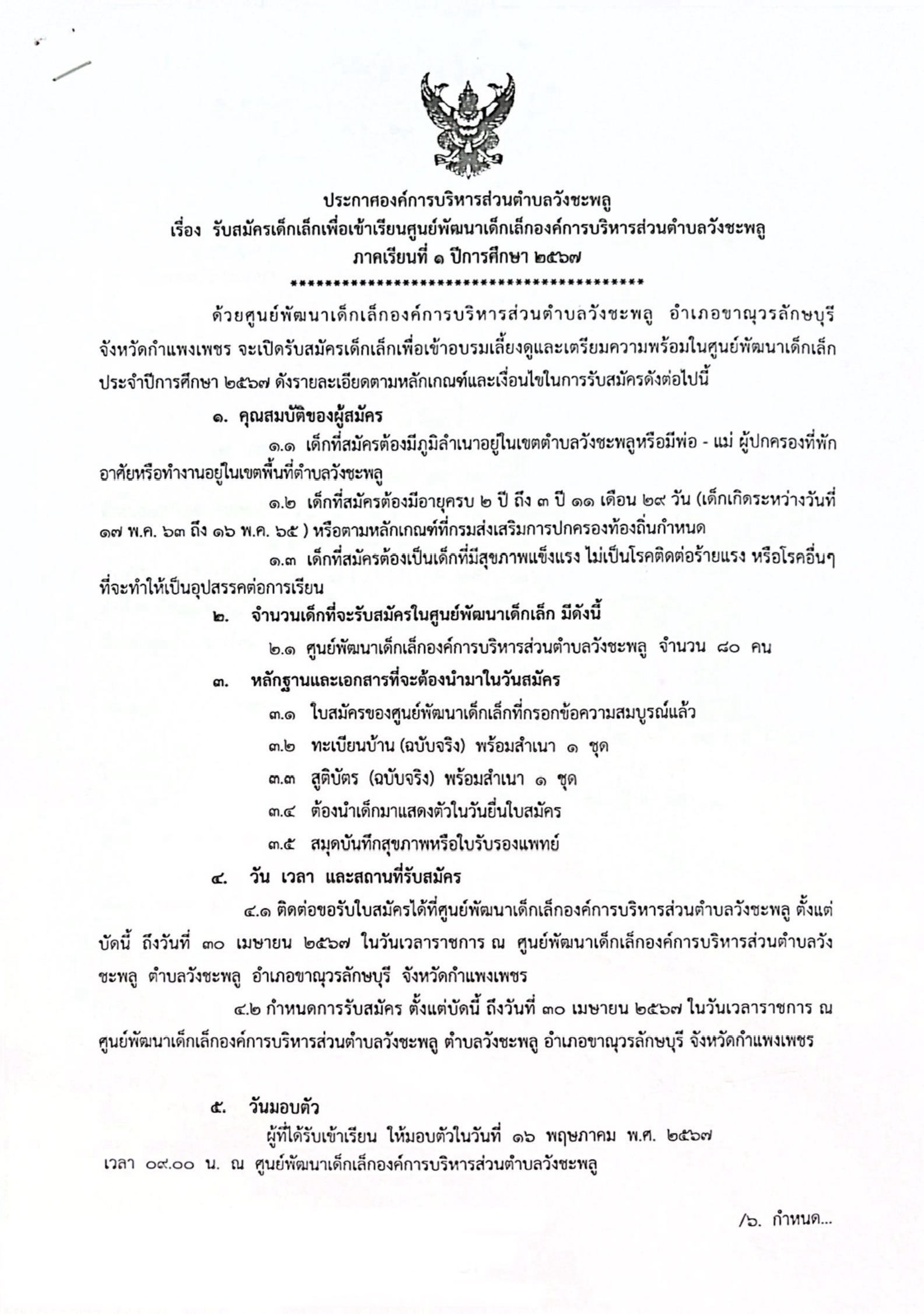 ➡️รายละเอียดตามประกาศองค์การบริหารส่วนตำบลวังชะพลู เรื่อง รับสมัครเด็กเล็กเพื่อเข้าเรียนศุนย์พัฒนาเด็กเล็กองค์การบริหารส่วนตำบลวังชะพลู ภาคเรียนที่ 1 ปีการศึกษา 2567