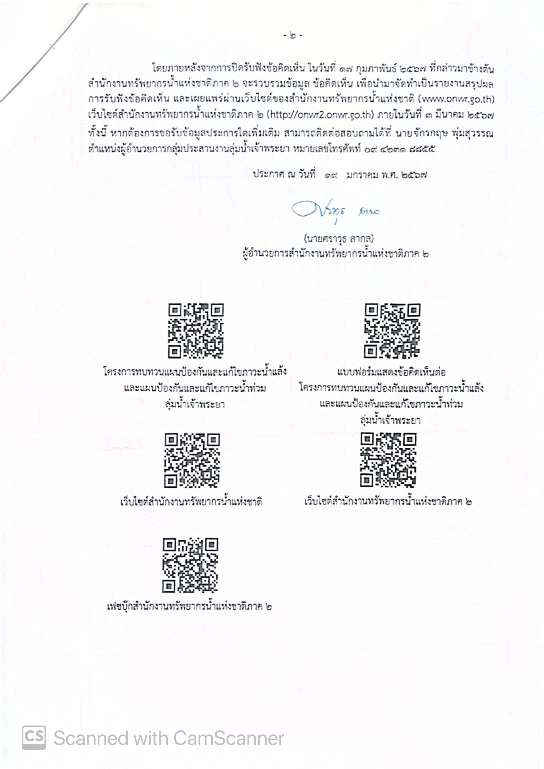 ประกาศสำนักงานทรัพยากรนํ้าแห่งชาติภาค 2 เรื่อง ขอเชิญชวนแสดงความคิดเห็นต่อโครงการการทบทวนแผนป้องกันและแก้ไขภาวะนํ้าแล้ง และแผนป้องกันและแก้ไขภาวะนํ้าท่วมลุ่มแม่นํ้าเจ้าพระยา
