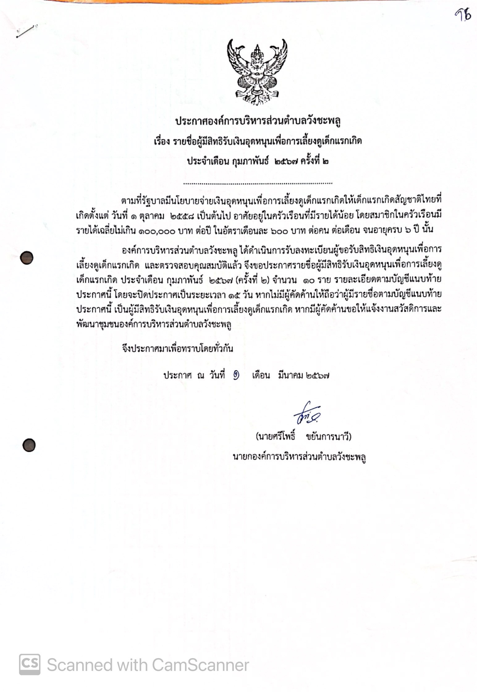 ประกาศองค์การบริหารส่วนตำบลวังชะพลู เรื่อง รายชื่อผู้มีสิทธิรับเงินอุดหนุนเพื่อการเลี้ยงดูเด็กแรกเกิด ประจำเดือน กุมภาพันธ์ 2567 ครั้งที่ 2