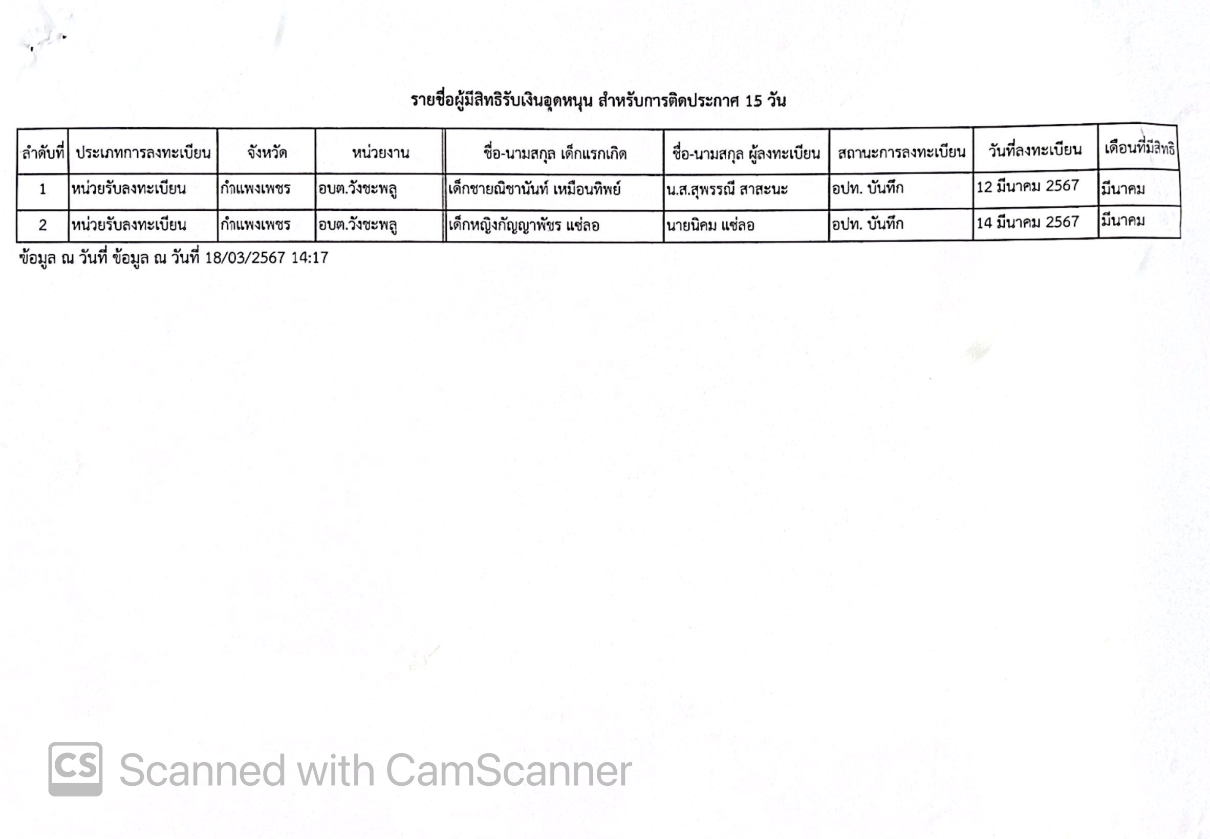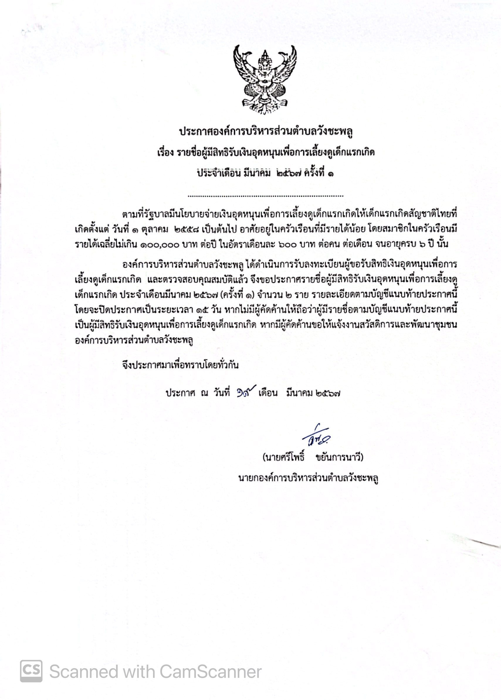ประกาศองค์การบริหารส่วนตำบลวังชะพลู เรื่อง รายชื่อผู้มีสิทธิรับเงินอุดหนุนเพื่อการเลี้ยงดูเด็กแรกเกิด ประจำเดือน มีนาคม 2567 ครั้งที่ 1