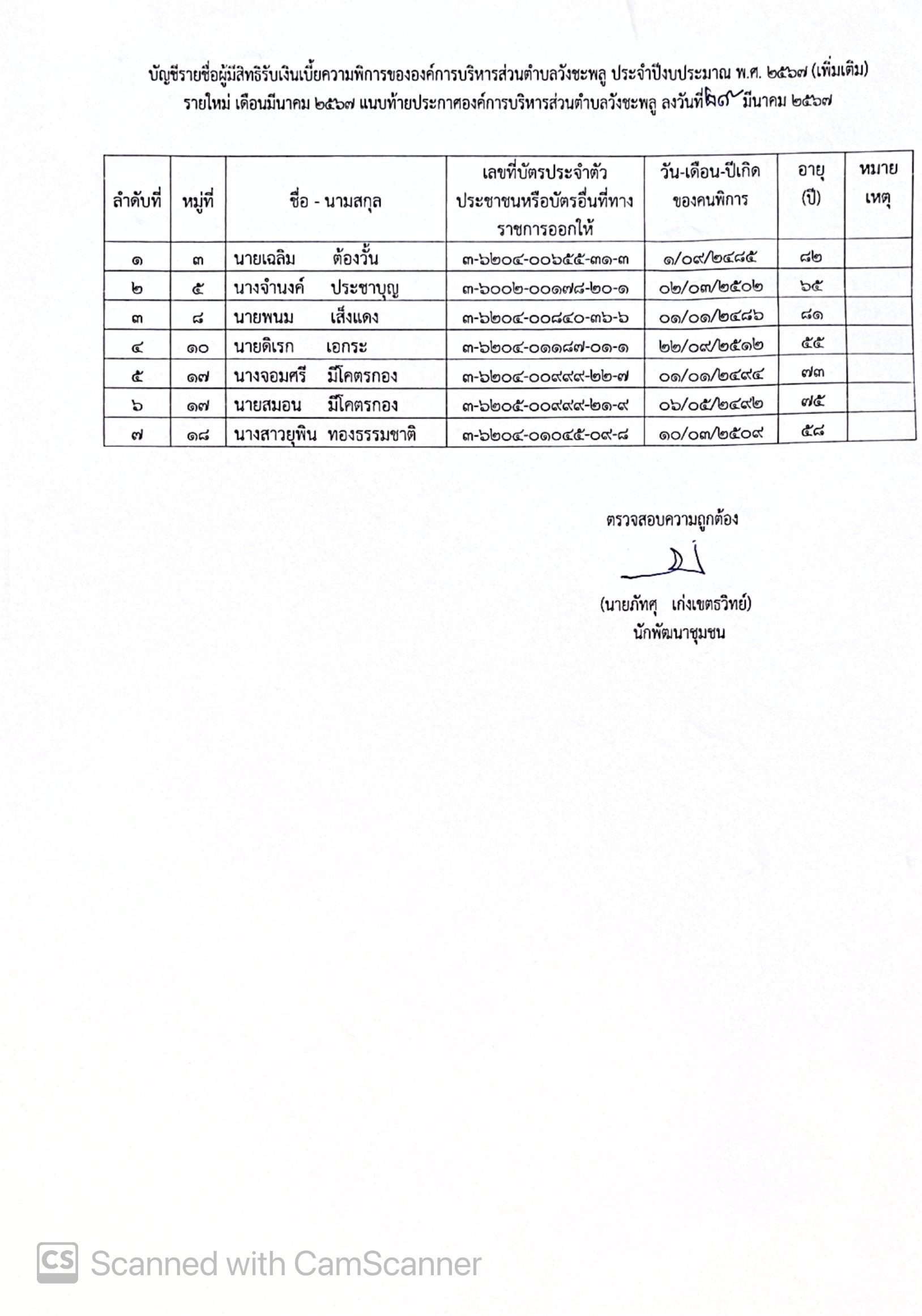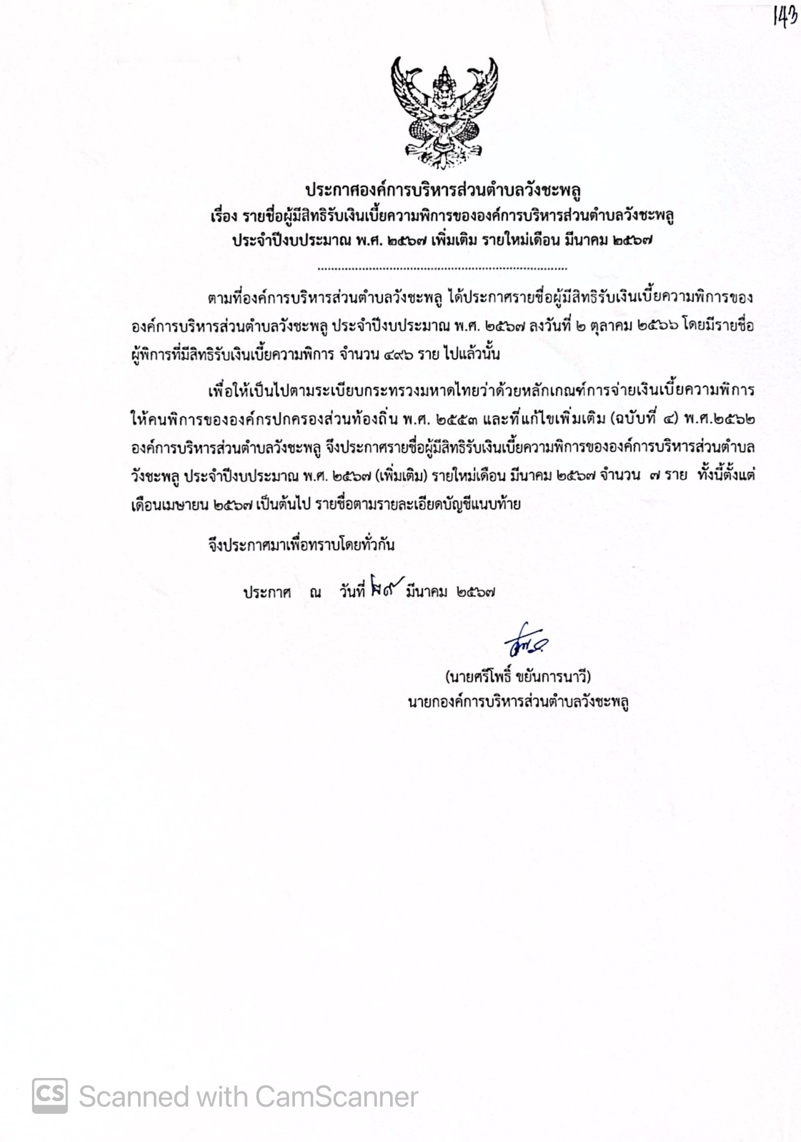 ประกาศองค์การบริหารส่วนตำบลวังชะพลู เรื่อง รายชื่อผู้มีสิทธิรับเงินเบี้ยความพิการขององค์การบริหารส่วนตำบลวังชะพลู ประจำปีงบประมาณ พ.ศ 2567 เพิ่มเติม รายใหม่เดือนมีนาคม 2567