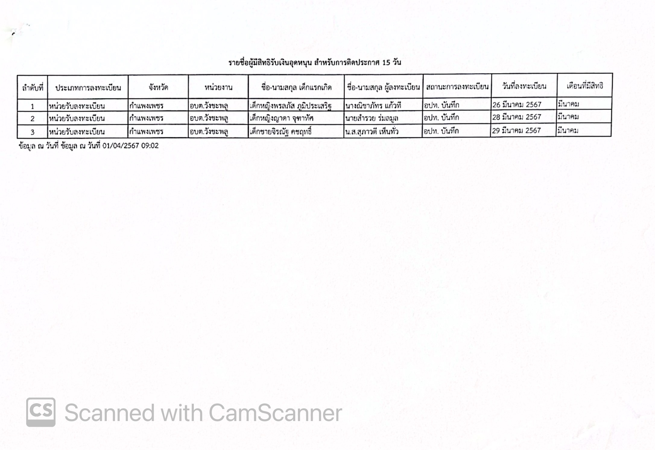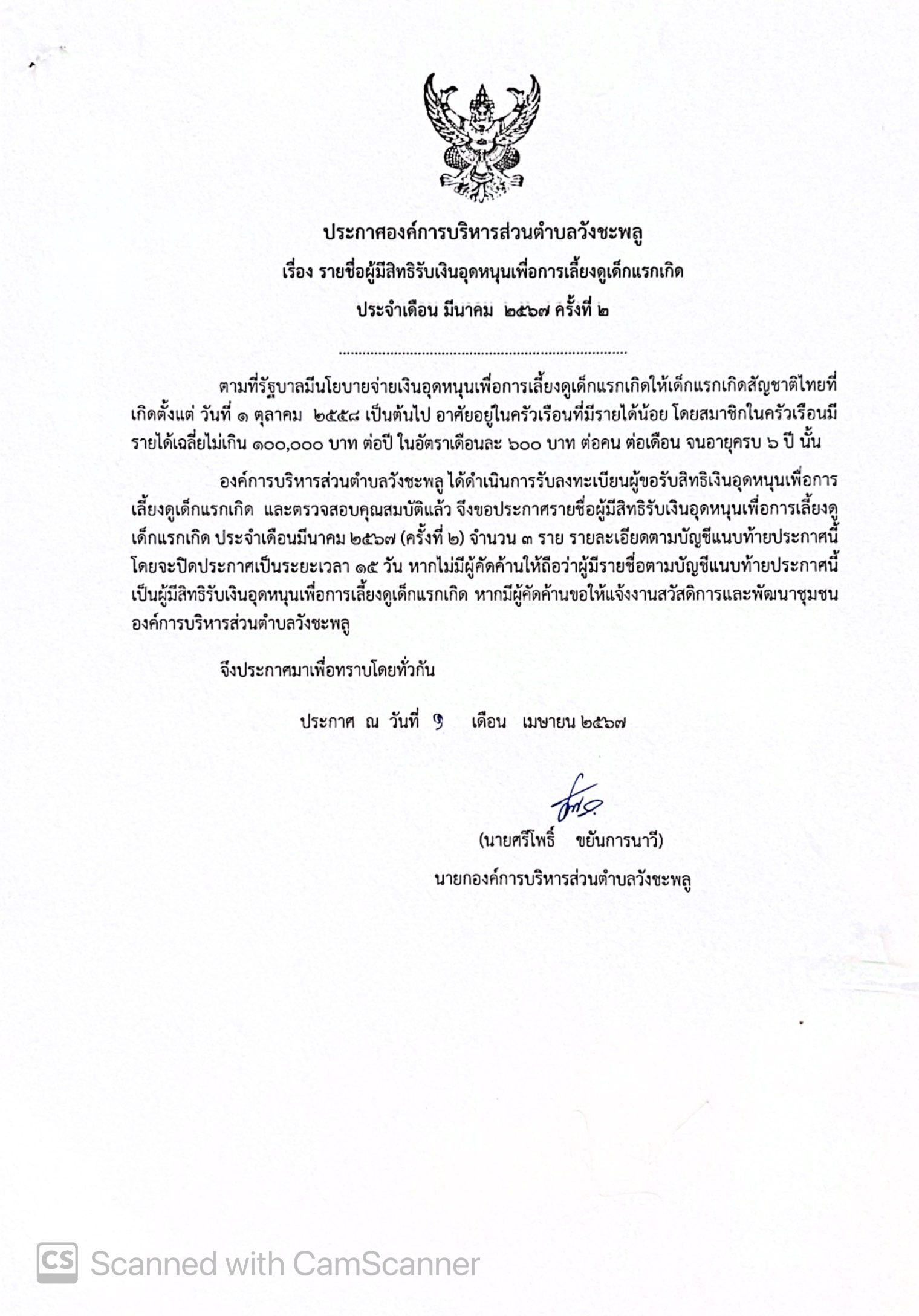 ประกาศองค์การบริหารส่วนตำบลวังชะพลู เรื่อง รายชื่อผู้มีสิทธิรับเงินอุดหนุนเพื่อการเลี้ยงดูเด็กแรกเกิด ประจำเดือน มีนาคม 2567 ครั้งที่ 2