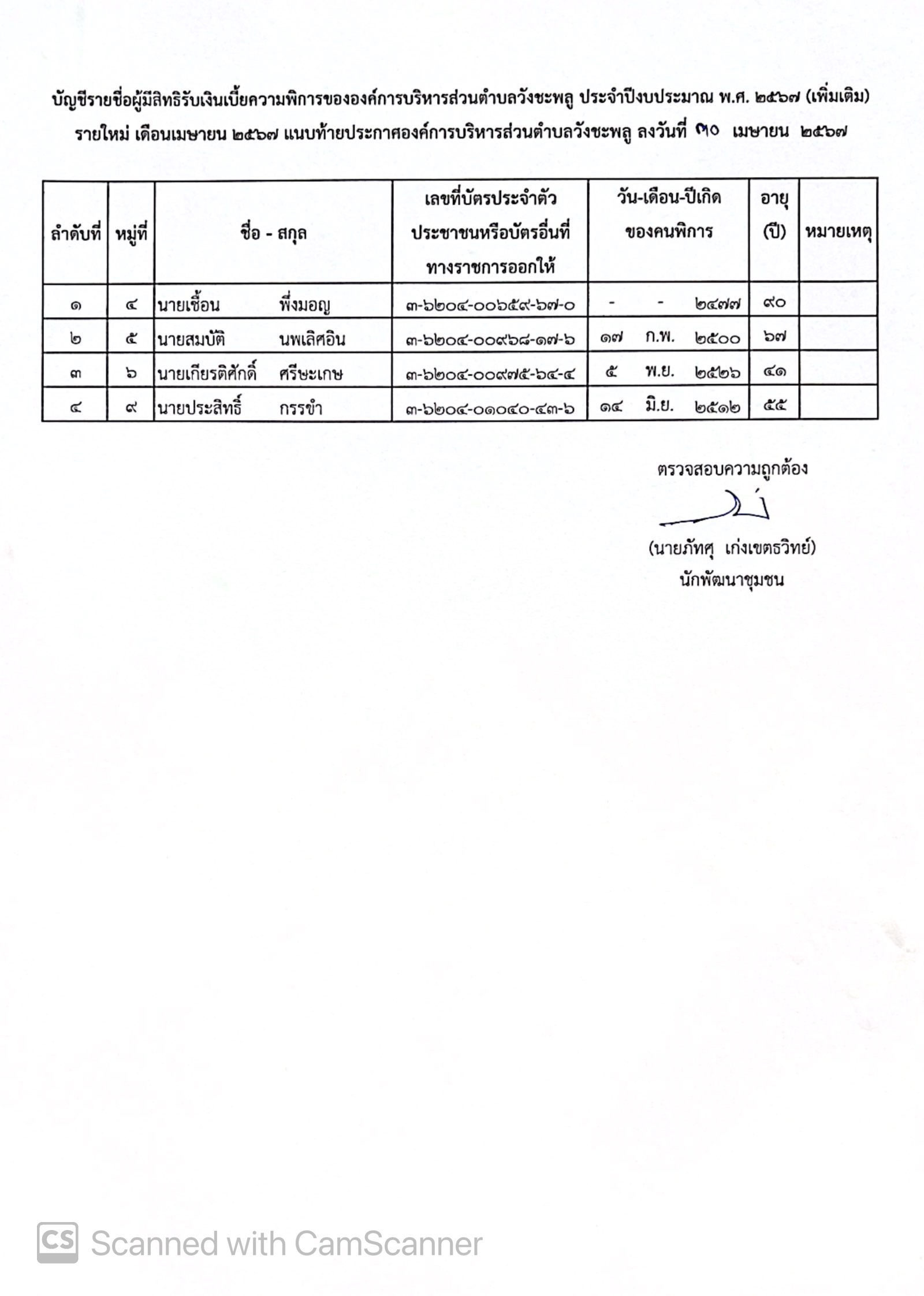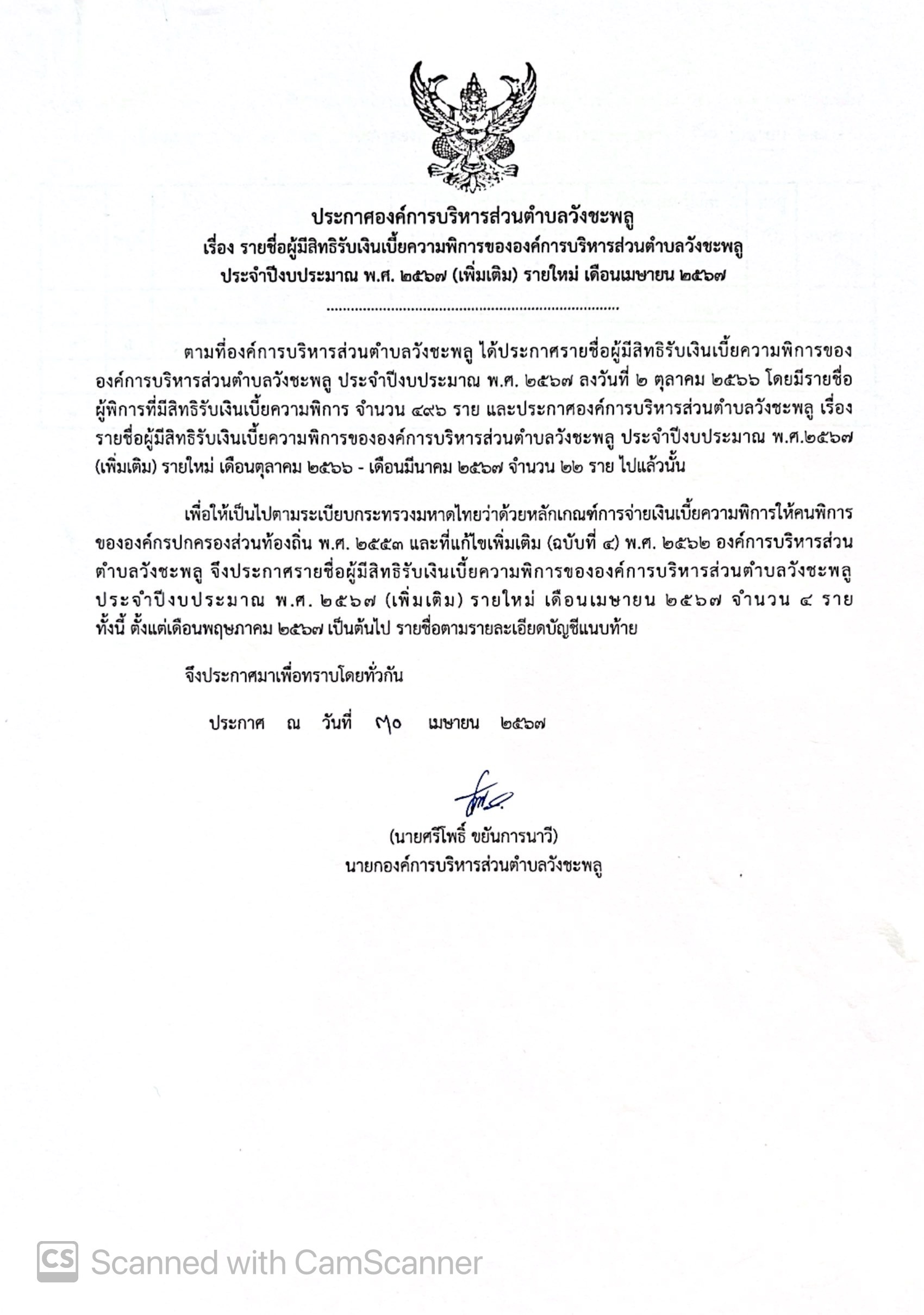 ประกาศองค์การบริหารส่วนตำบลวังชะพลู เรื่อง รายชื่อผู้มีสิทธิรับเงินเบี้ยความพิการขององค์การบริหารส่วนตำบลวังชะพลู ประจำปีงบประมาณ พ.ศ. 2567 (เพิ่มเติม) รายใหม่ เดือนเมษายน 2567