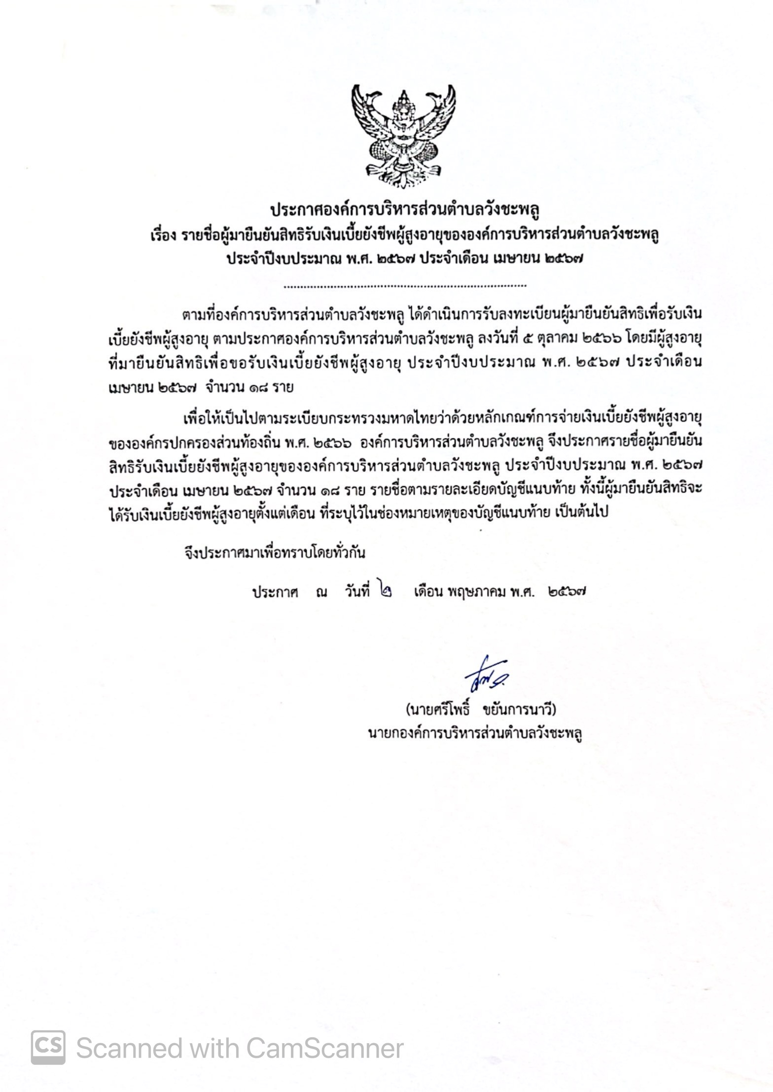ประกาศองค์การบริหารส่วนตำบลวังชะพลู เรื่อง รายชื่อผู้มายืนยันสิทธิรับเงินเบี้ยยังชีพผู้สูงอายุขององค์การบริหารส่วนตำบลวังชะพลู ประจำปีงบประมาณ พ.ศ 2567 ประจำเดือนเมษายน 2567