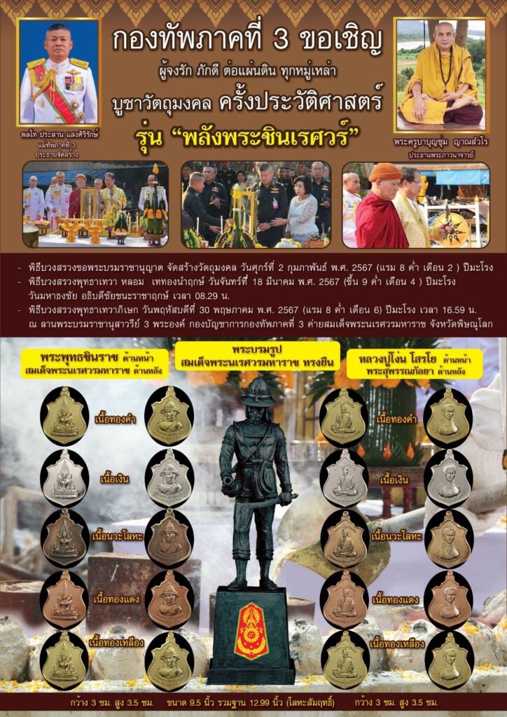 กองทัพภาคที่ 3 ได้จัดสร้างวัตถุมงคลรุ่น พลังพระชินเรศวร์ มีวัตถุประสงค์เพื่อนำรายได้มาช่วยเหลือกำลังพลและครอบครัวผู้ที่บาดเจ็บหรือพิการทุพพลภาพจากการปฏิบัติหน้าที่ รวมทั้งซ่อมแซมและสรา้งบ้านให้แก่ผู้ยากไร้ในพื้นที่ 17 จังหวัดภาคเหนือ จึงเชิญชวนผู้มีจิตศรัทธาร่วมสั่งจองวัตถุมงคลรุ่น พลังพระชินเรศวร์