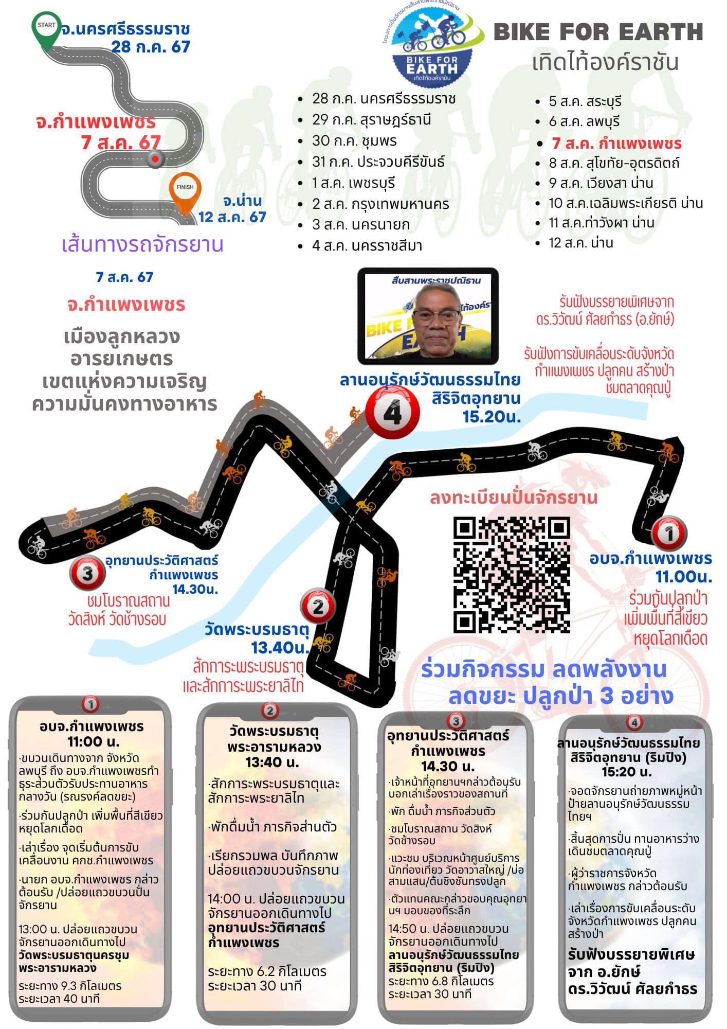 โดยในวันพุธที่ 7 สิงหาคม 2567 ขบวนปั่นจักรยานจะถึงจังหวัดกำแพงเพชร และได้จัดให้มีขบวนปันจักรยาน เริ่มต้นตั้งแต่เวลา 13.00 น ออกจากองค์การบริหารส่วนจังหวัดกำแพงเพชร - แวะพักสักการะ วัดพระบรมธาตุนครชุม - เข้าเยี่ยมชมอุทยานประวัติศาสตร์กำแพงเพชร - สิ้นสุดการปั่นฯ บริเวณลานอนุรักษ์วัฒนธรรมไทยสิริจิตอุทยาน โดยภายในลานอนุรักษ์ฯ ตั้งแต่เวลา 15.00 น. พบกับตลาดจำหน่ายสินค้าและผลิตภัณฑ์ทางการเกษตรจากเครือกสิกรรมธรรมชาติ "ตลาดคุณปู่" และเวลา 17.00 น. รับฟังการบรรยายพิเศษโดย ดร.วิวัฒน์ ศัลยกำธร (อ.ยักษ์)