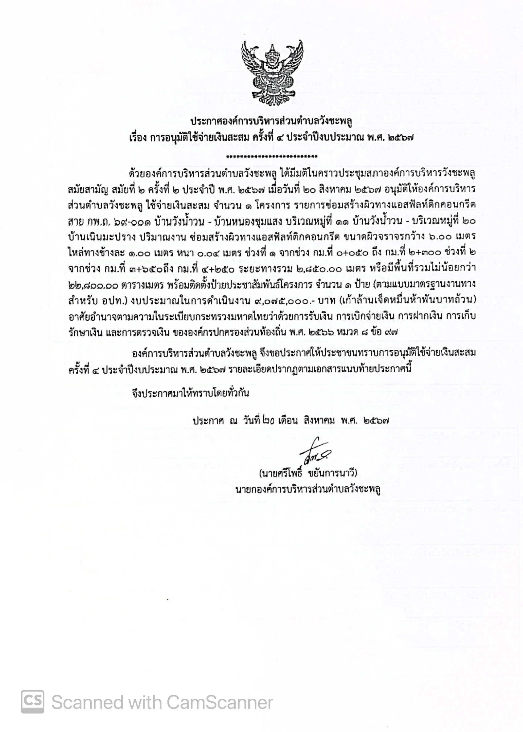 ประกาศองค์การบริหารส่วนตำบลวังชะพลู เรื่อง การอนุมัติใช้จ่ายเงินสะสม ครั้งที่ 4 ประจำปีงบประมาณ พ.ศ. 2567 จำนวน 1 โครงการ