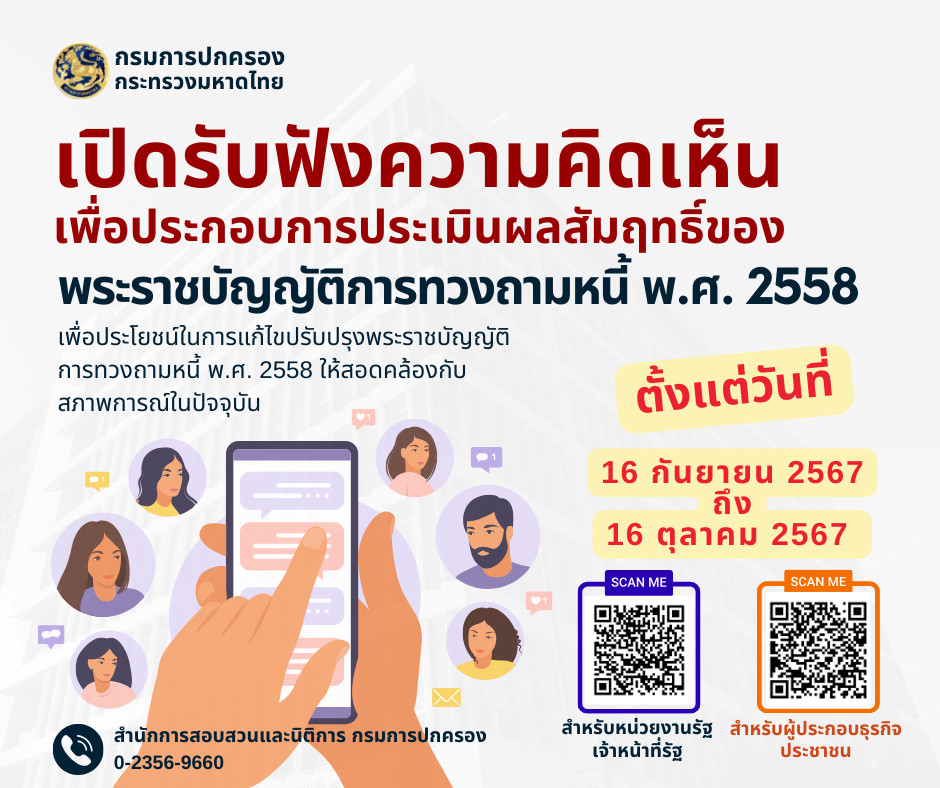 เชิญชวนแสดงความคิดเห็นเพื่อประกอบการประเมินผลสัมฤทธิ์ของพระราชบัญญัติการทวงถามหนี้ พ.ศ. 2558