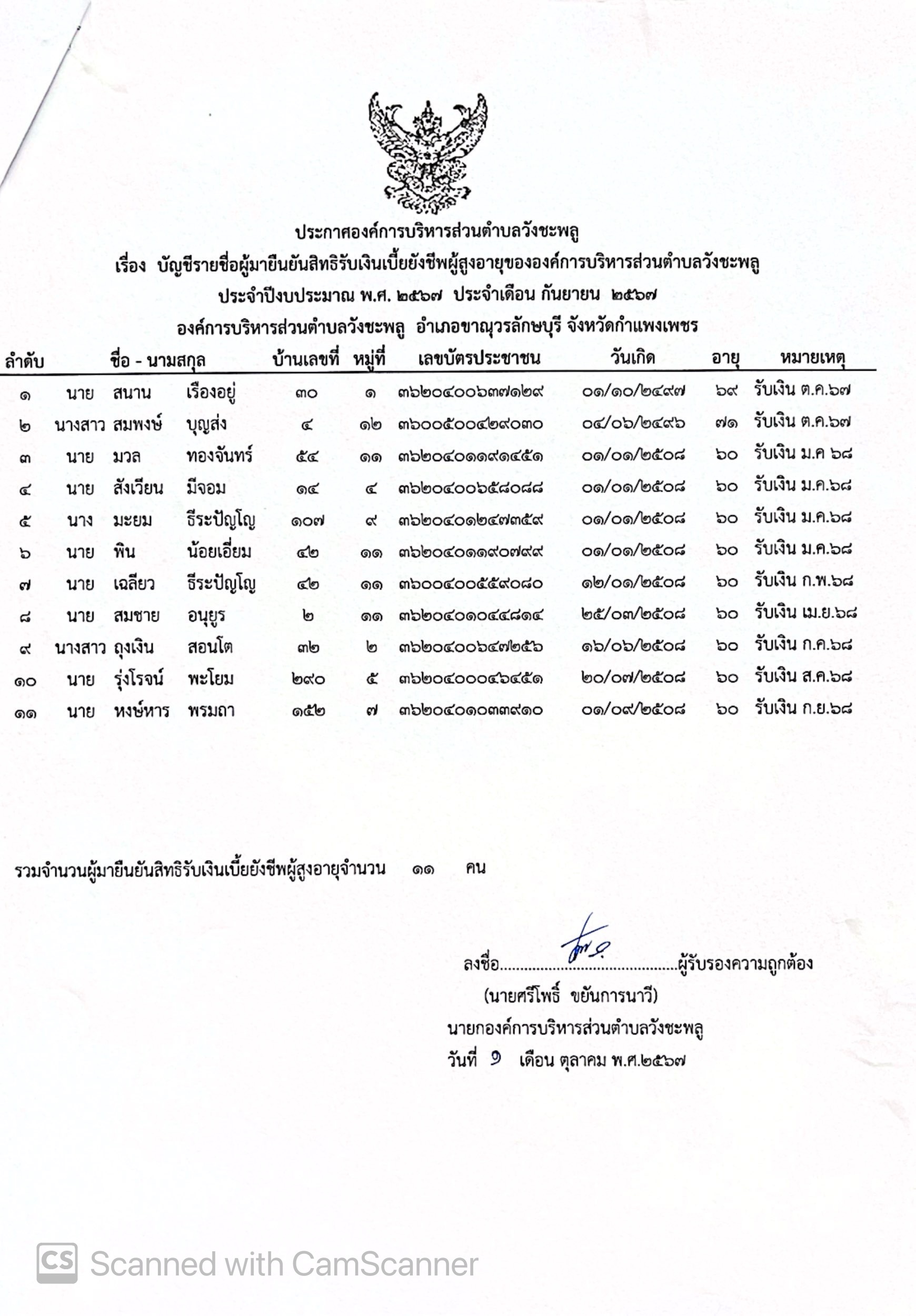 ประกาศองค์การบริหารส่วนตำบลวังชะพลู เรื่อง รายชื่อผู้มายืนยันสิทธิรับเบี้ยผู้สูงอายุขององค์การบริหารส่วนตำบลวังชะพลู ประจำปีงบประมาณ พ.ศ. 2567 ประจำเดือน กันยายน 2567