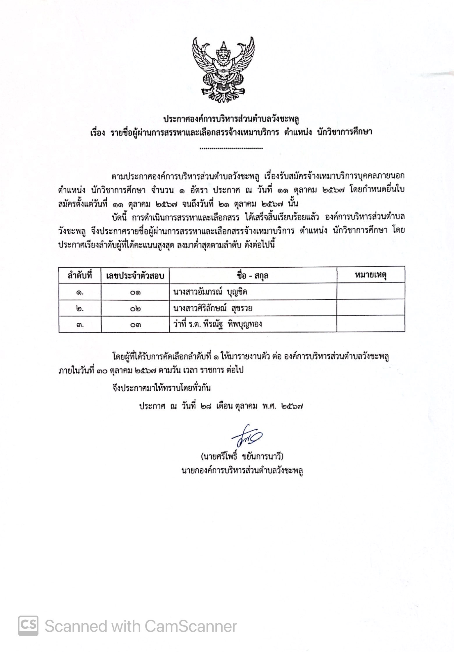 ประกาศองค์การบริหารส่วนตำบลวังชะพลู เรื่อง รายชื่อผู้ผ่านการสรรหาและเลือกสรรจ้างเหมาบริการ ตำแหน่ง นักวิชาการศึกษา