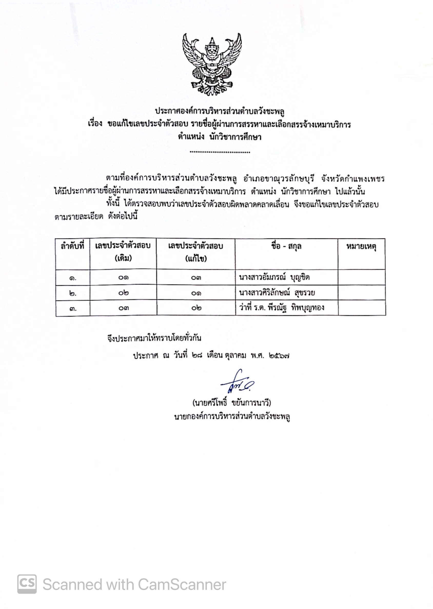 ประกาศองค์การบริหารส่วนตำบลวังชะพลู เรื่อง ขอแก้ไขเลขประจำตัวสอบ รายชื่อผู้ผ่านการสรรหาและเลือกสรรจ้างเหมาบริการ ตำแหน่ง นักวิชาการศึกษา