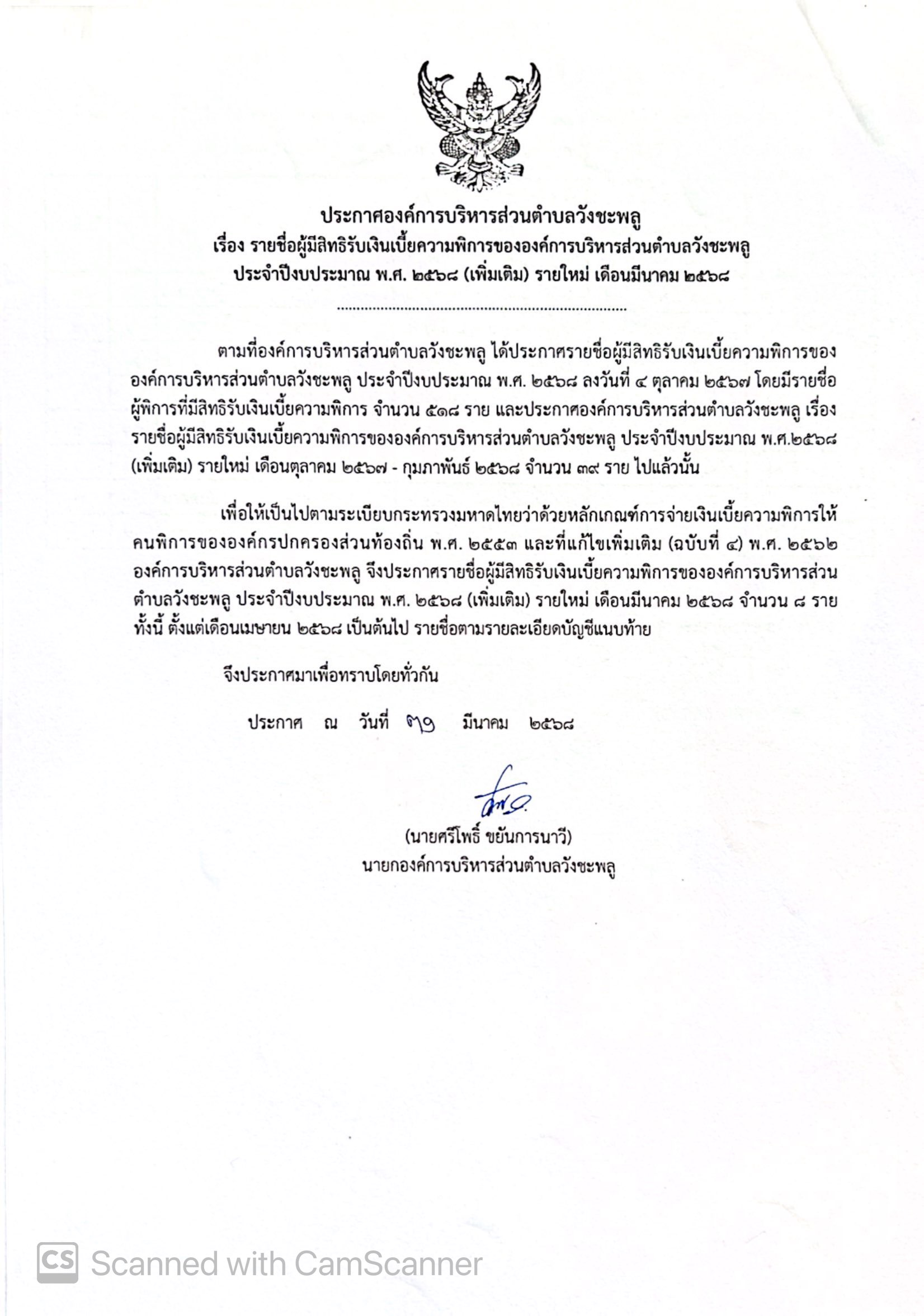 ประกาศองค์การบริหารส่วนตำบลวังชะพลู เรื่อง รายชื่อผู้มีสิทธิรับเงินเบี้ยความพิการขององค์การบริหารส่วนตำบลวังชะพลู ประจำปีงบประมาณ พ.ศ. 2568 (เพิ่มเติม) รายใหม่ เดือนมีนาคม 2568