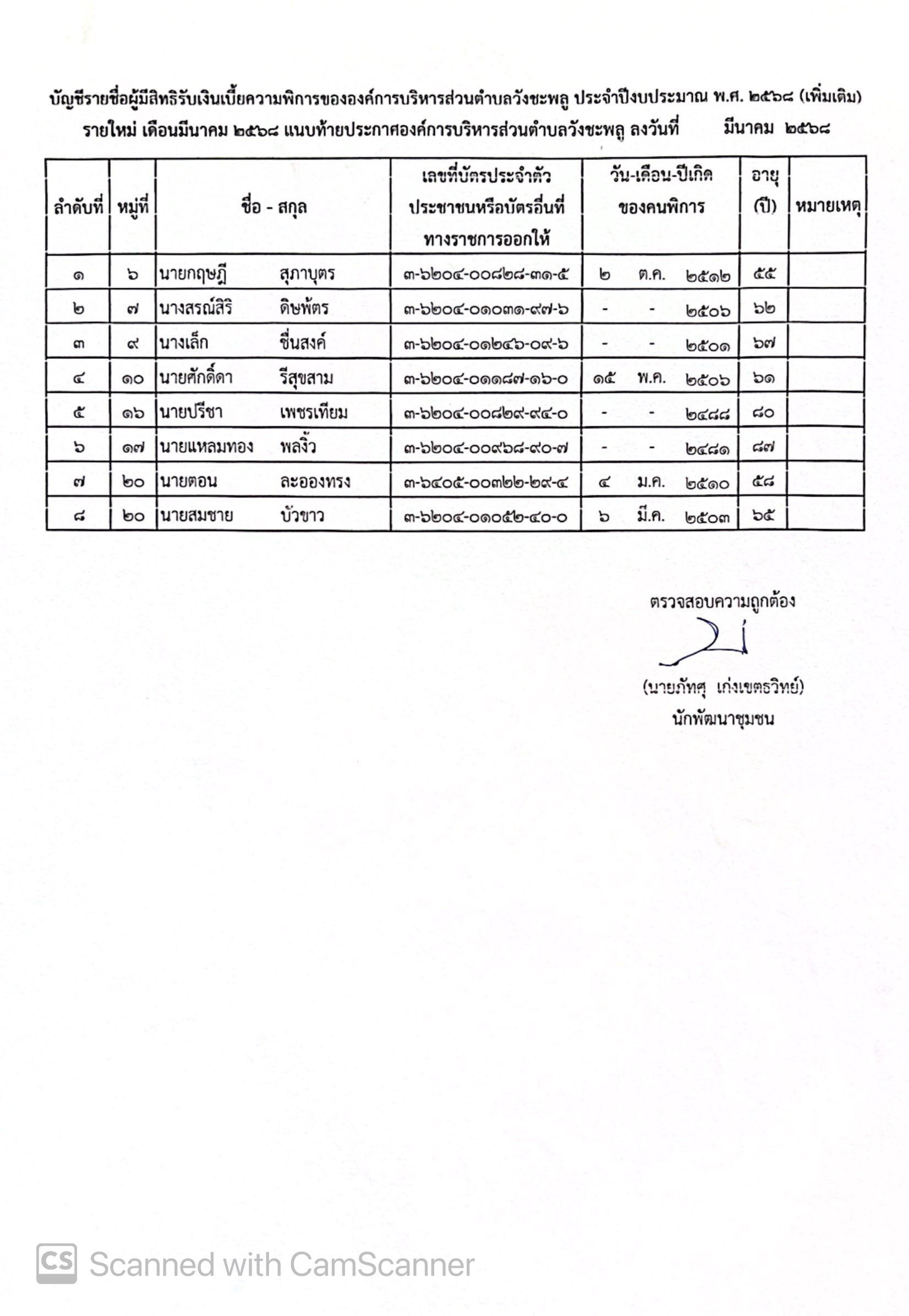 ประกาศองค์การบริหารส่วนตำบลวังชะพลู เรื่อง รายชื่อผู้มีสิทธิรับเงินเบี้ยความพิการขององค์การบริหารส่วนตำบลวังชะพลู ประจำปีงบประมาณ พ.ศ. 2568 (เพิ่มเติม) รายใหม่ เดือนมีนาคม 2568
