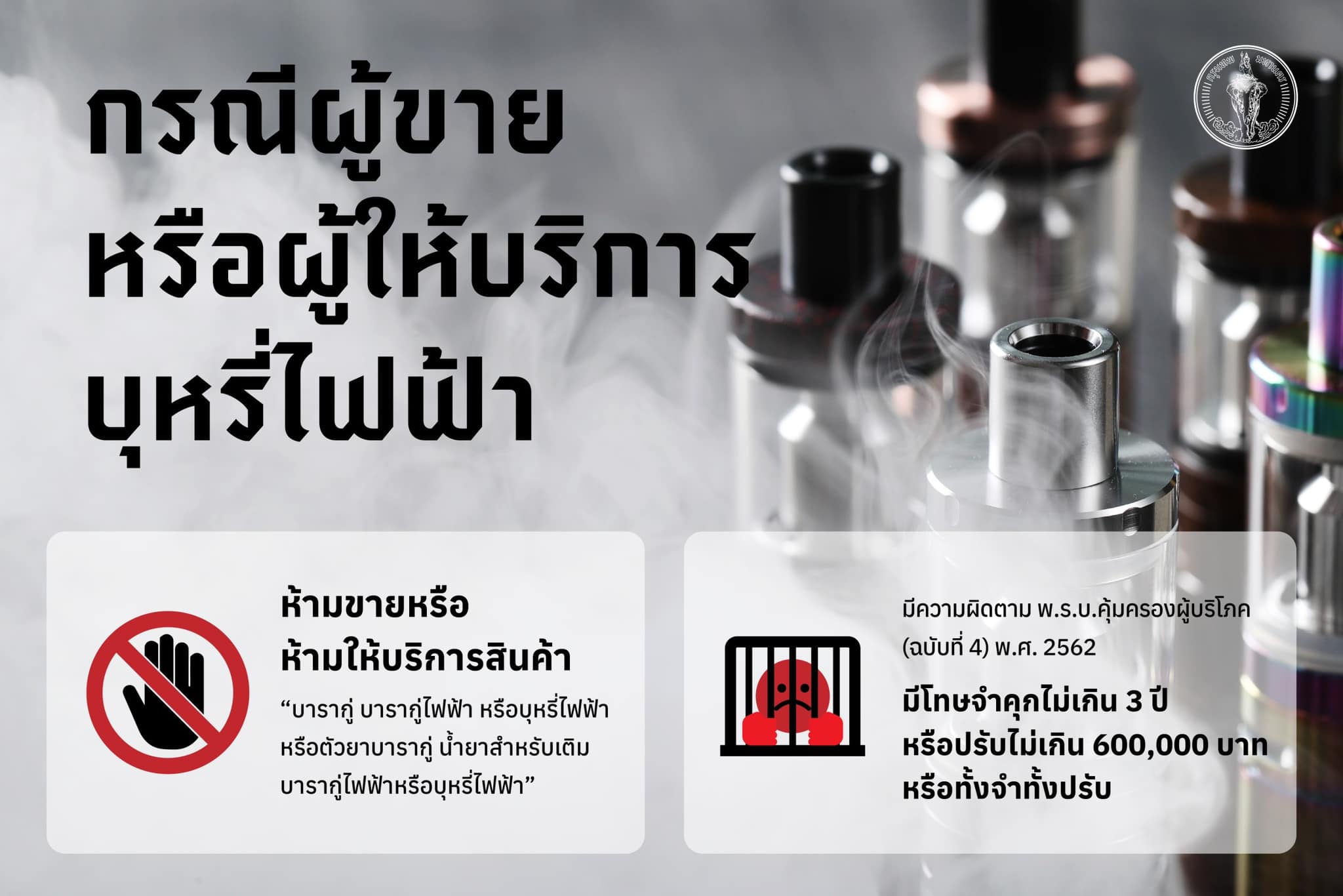 ห้ามขายหรือห้ามให้บริการสินค้า “บารากู่ บารากู่ไฟฟ้าหรือบุหรี่ไฟฟ้า หรือตัวยาบารากู่ น้ำยาสำหรับเติมบารากู่ไฟฟ้าหรือบุหรี่ไฟฟ้า” มีความผิดตาม พ.ร.บ.คุ้มครองผู้บริโภค(ฉบับที่ 4) พ.ศ. 2562 มีโทษจำคุกไม่เกิน 3 ปี หรือปรับไม่เกิน 600,000 บาท หรือทั้งจำทั้งปรับ