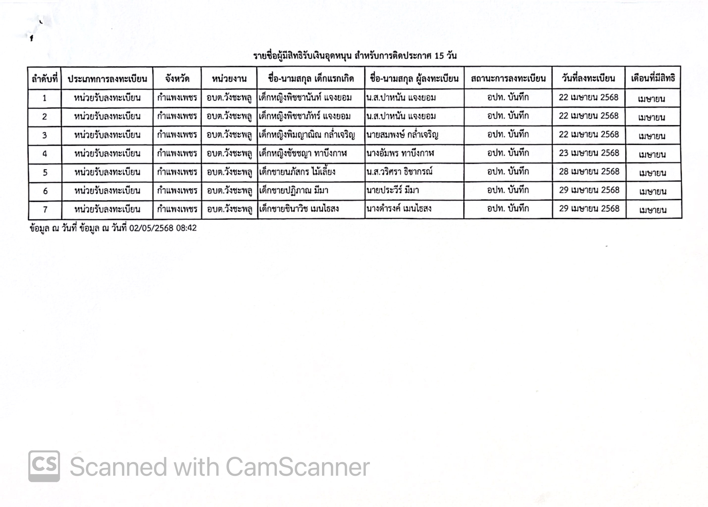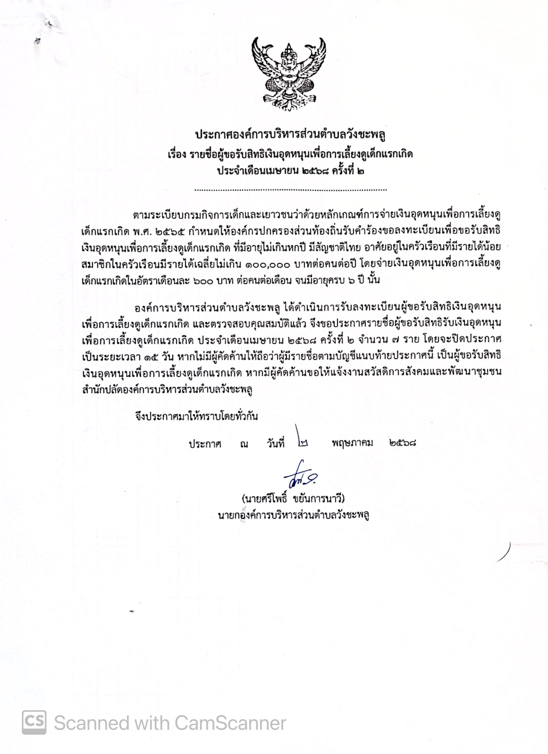ประกาศองค์การบริหารส่วนตำบลวังชะพลู เรื่อง รายชื่อผู้ขอรับสิทธิเงินอุดหนุนเพื่อการเลี้ยงดูเด็กแรกเกิด ประจำเดือนเมษายน 2568 ครั้งที่ 2