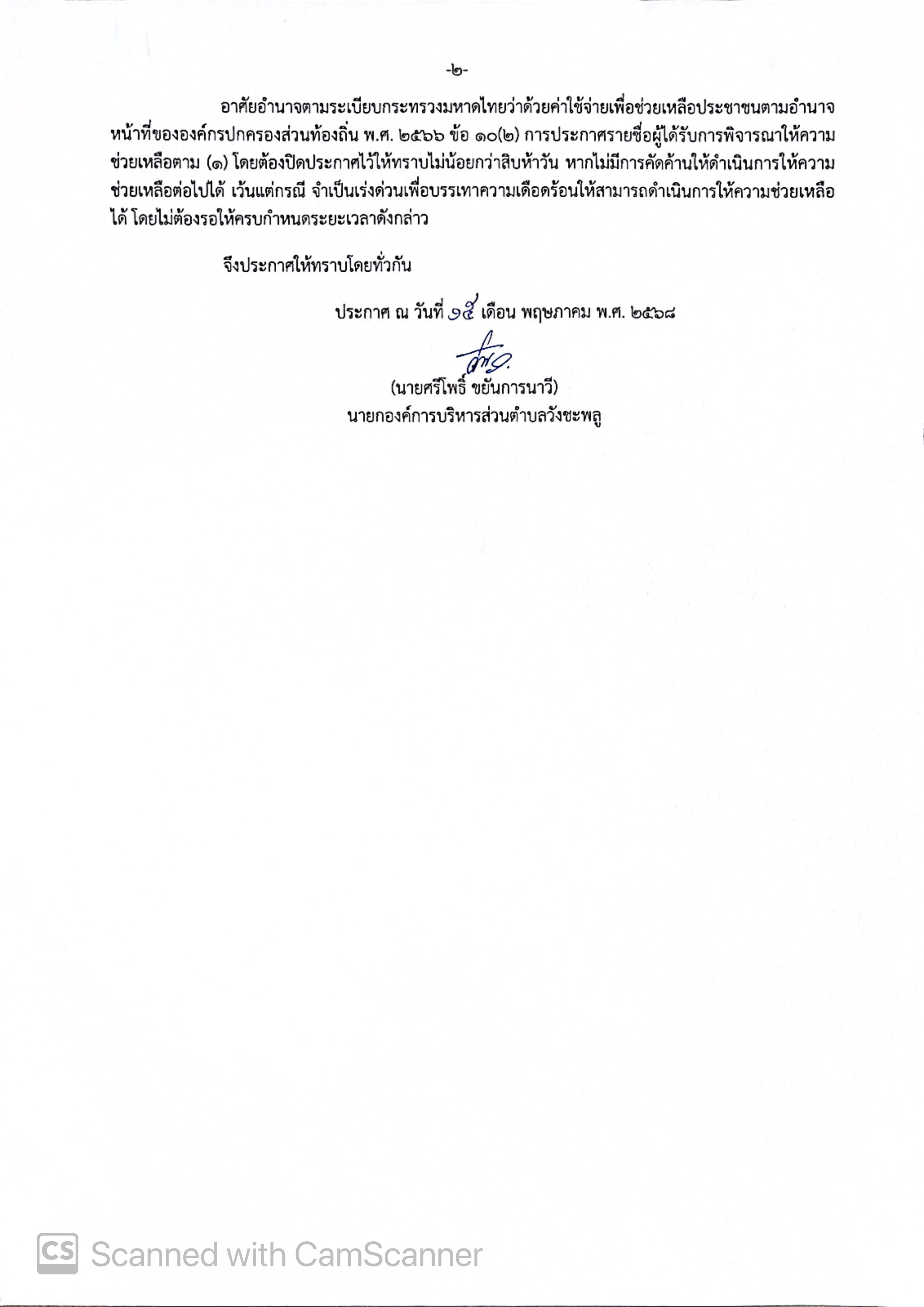 ประกาศองค์การบริหารส่วนตำบลวังชะพลู เรื่อง รายชื่อผู้ที่ได้รับการพิจารณาให้ความช่วยเหลือ