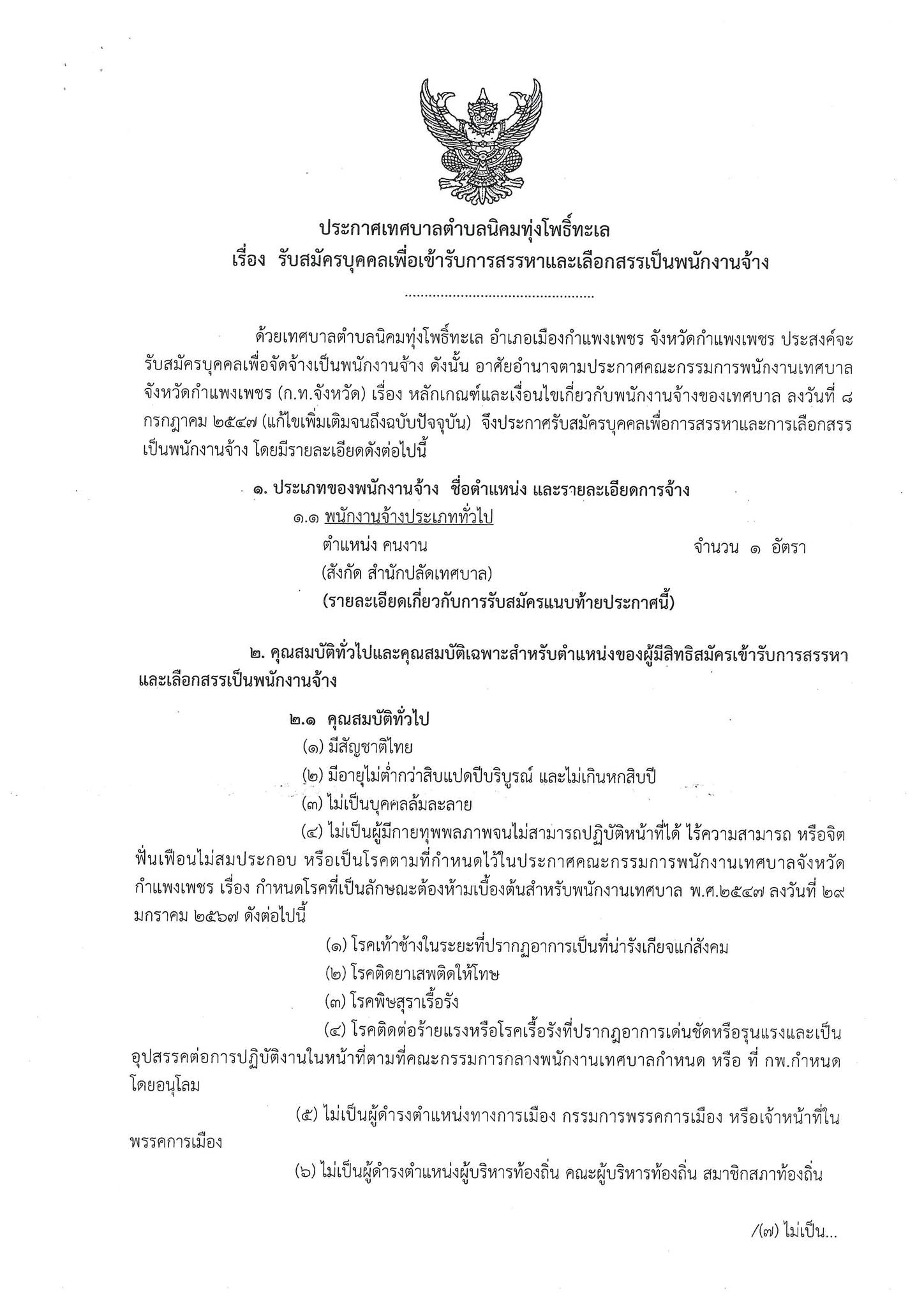 ประกาศเทศบาลตำบลนิคมทุ่งโพธิ์ทะเล เรื่อง รับสมัครบุคคลเพื่อเข้ารับการสรรหาและเลือกสรรเป็นพนักงานจ้าง (ประเภทพนักงานจ้างทั่วไป ตำแหน่ง คนงาน) จำนวน 1 อัตรา