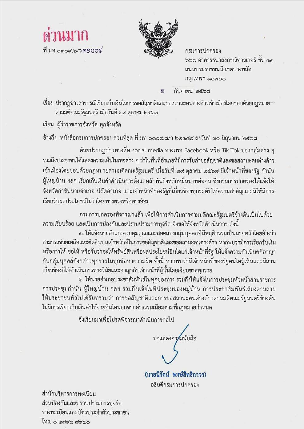 กรมการปกครอง…กำชับ ห้ามเรียกเก็บเงินในการยื่นขอสัญชาติและยื่นสถานะคนต่างด้าวเข้าเมืองโดยชอบด้วยกฎหมาย