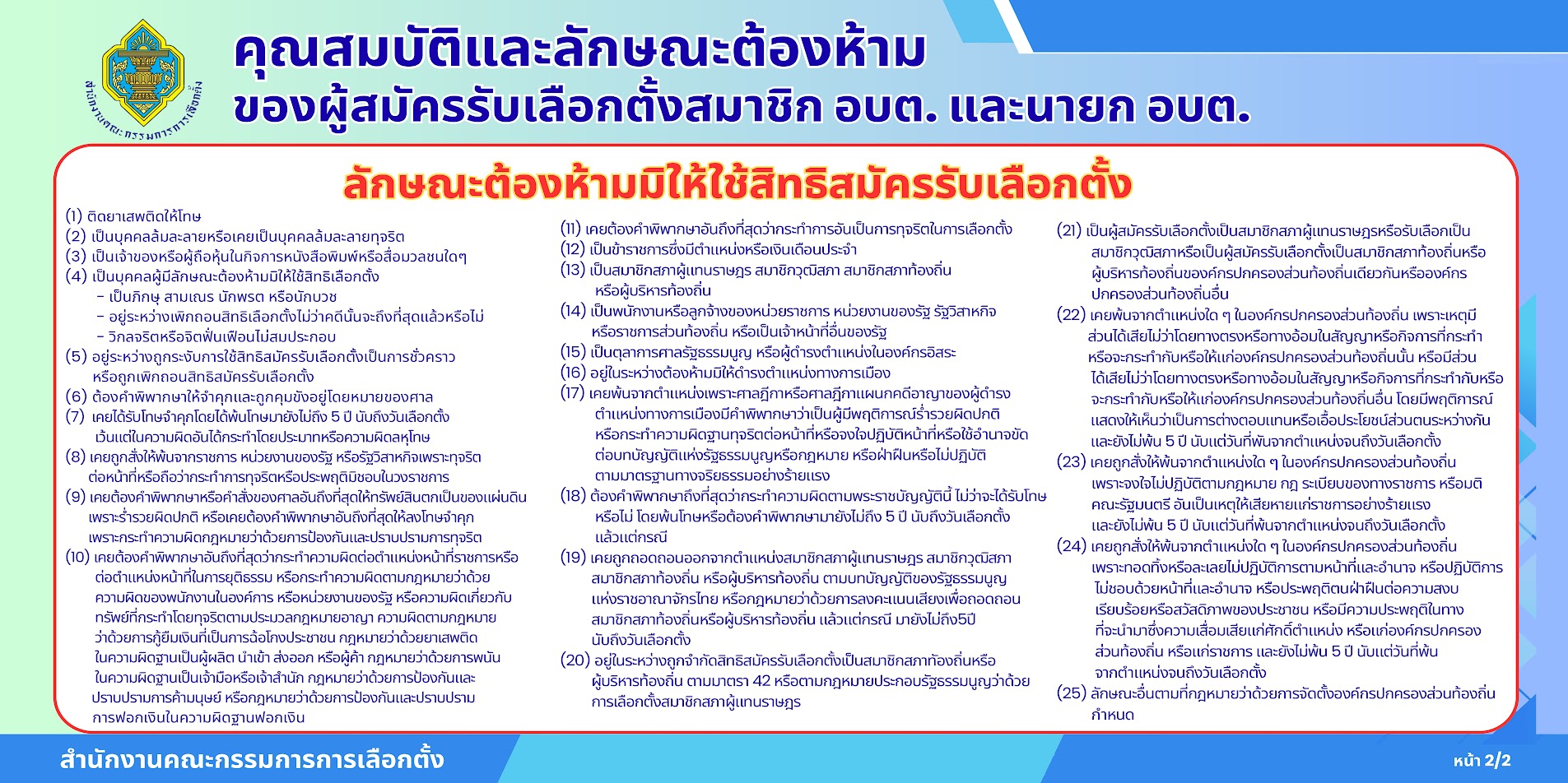 คุณสมบัติและลักษณะต้องห้าม ของผู้สมัครรับเลือกตั้งสมาชิก อบต. และนายก อบต.