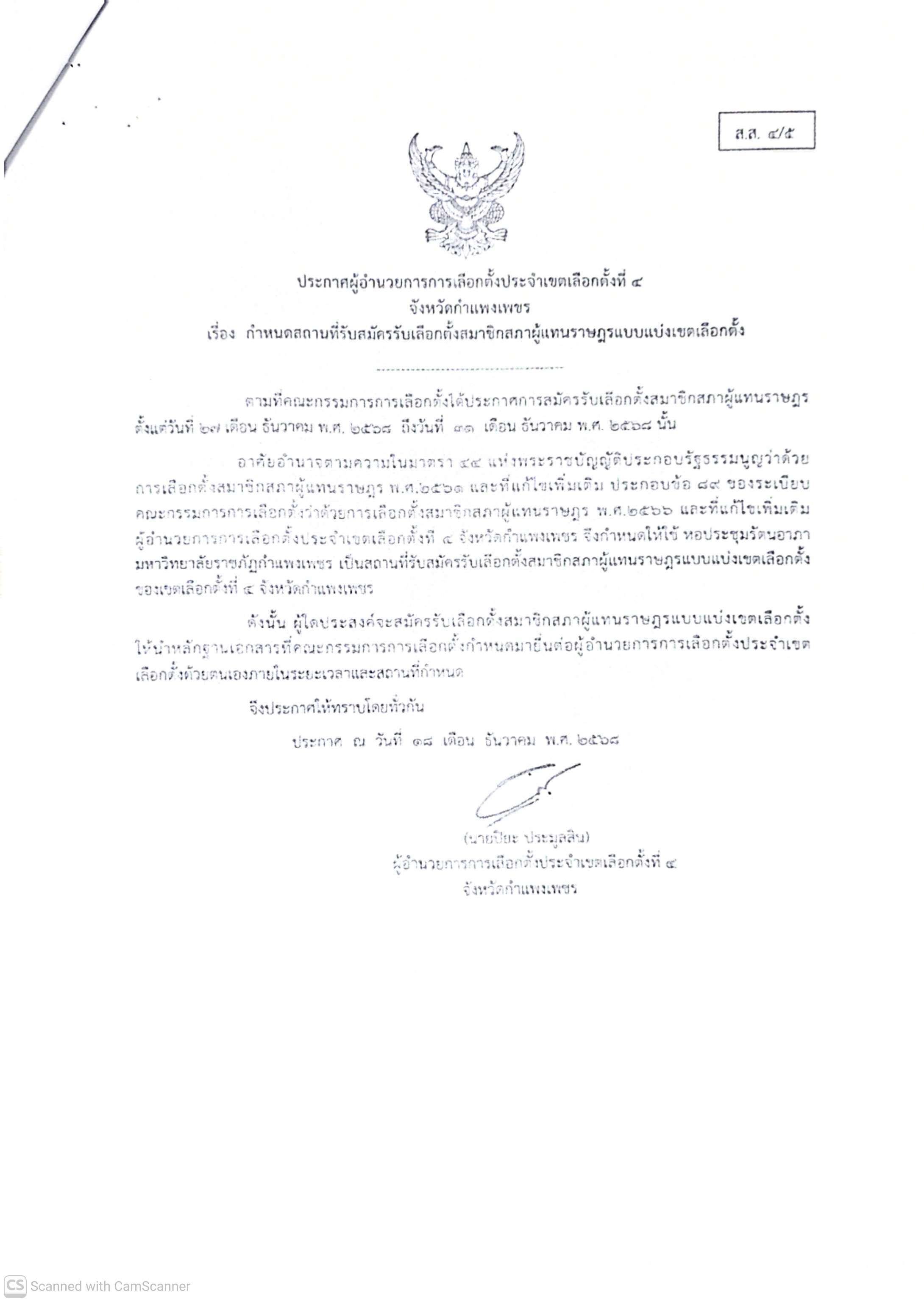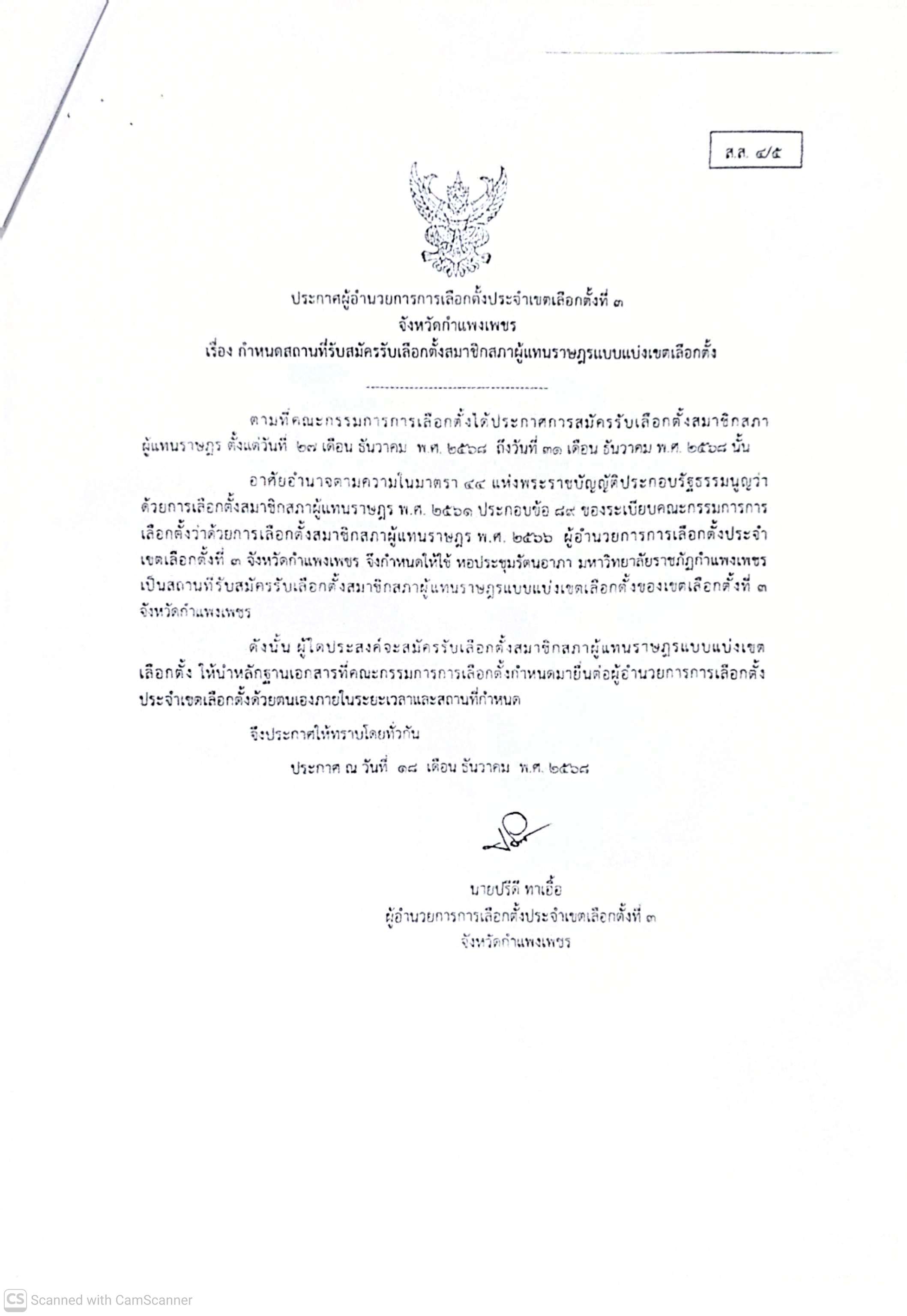 ประกาศผู้อำนวยการการเลือกตั้งประจำเขตเลือกตั้งที่ 1-4 จังหวัดกำแพงเพชร เรื่อง กำหนดสถานที่รับสมัครรับเลือกตั้งสมาชิกสภาผู้แทนราษฎรแบบแบ่งเขตเลือกตั้ง