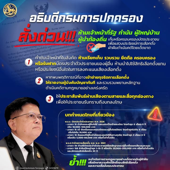 ห้ามเจ้าหน้าที่รัฐ กำนัน ผู้ใหญ่บ้าน และผู้นำท้องถิ่น เก็บ รวบรวม ยึดถือ ครอบครอง หรือรับฝากบัตรประชาชนของผู้อื่นไว้ หรือนำไปใช้สิทธิแทนผู้อื่นเพื่อแสวงประโยชน์อื่นใดการลงคะแนนเสียงเลือกตั้ง หรือยินยอมให้ผู้อื่นนำบัตรประจำตัวประชาชนของตนไปใช้สิทธิเลือกตั้งแทน ทั้งนี้ เพื่อรักษาความศักดิ์สิทธิ์ของสิทธิเลือกตั้งและความเชื่อมั่นของประชาชนต่อระบอบประชาธิปไตย สร้างความเชื่อมั่นต่อกระบวนการเลือกตั้งให้เป็นไปโดยสุจริต ยุติธรรมและโปร่งใส