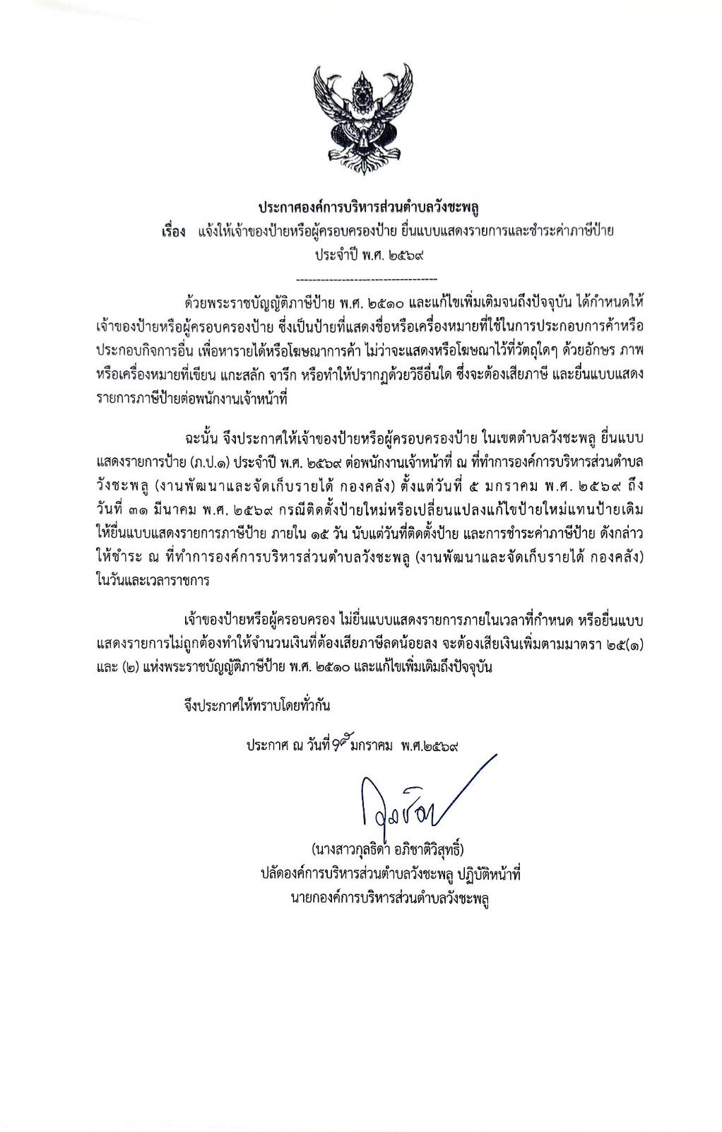 ประกาศองค์การบริหารส่วนตำบลวังชะพลู เรื่อง แจ้งให้เจ้าของป้ายหรือผู้ครอบครองป้าย ยื่นแบบแสงรายการะชำระชำระค่ายประจำปี พ.ศ. 2569