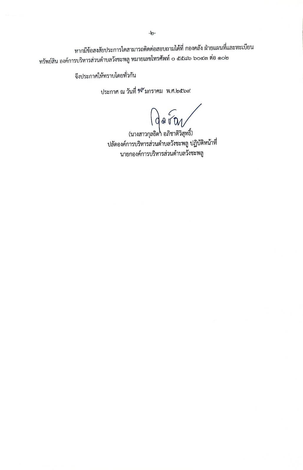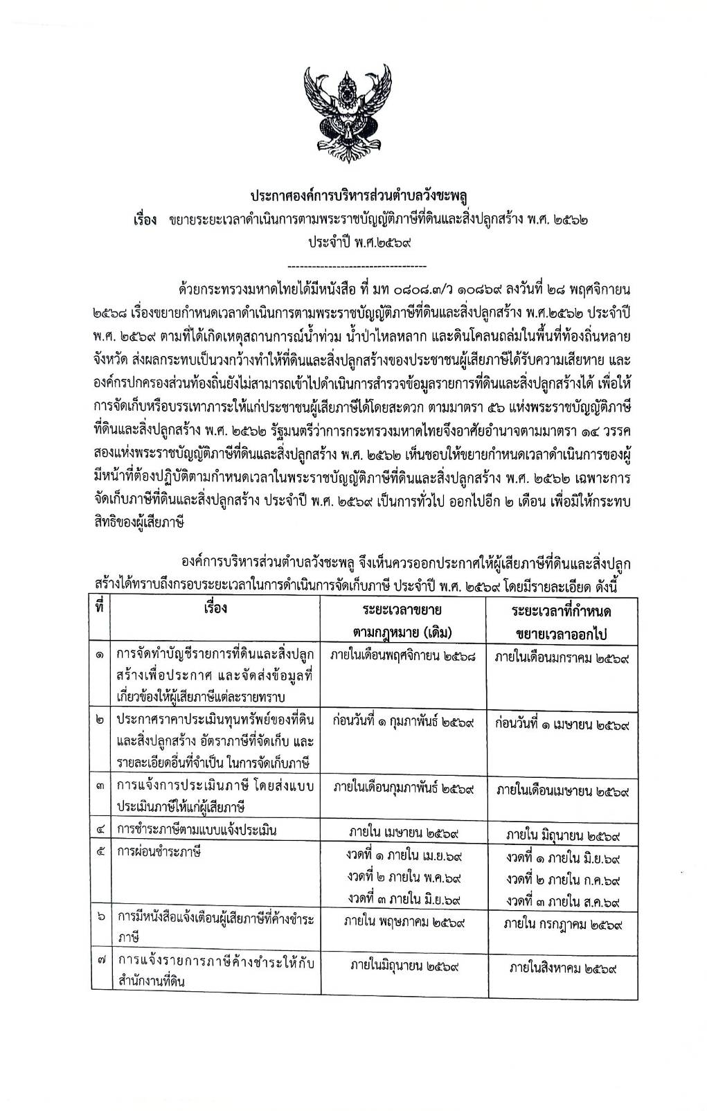 ประกาศองค์การบริหารส่วนตำบลวังชะพลู เรื่อง ขยายระยะเวลาดำเนินการตามพระราชบัญญัติภาษีที่ดินและสิ่งปลูกสร้าง พ.ศ. 2562 ประจำปี พ.ศ.2569