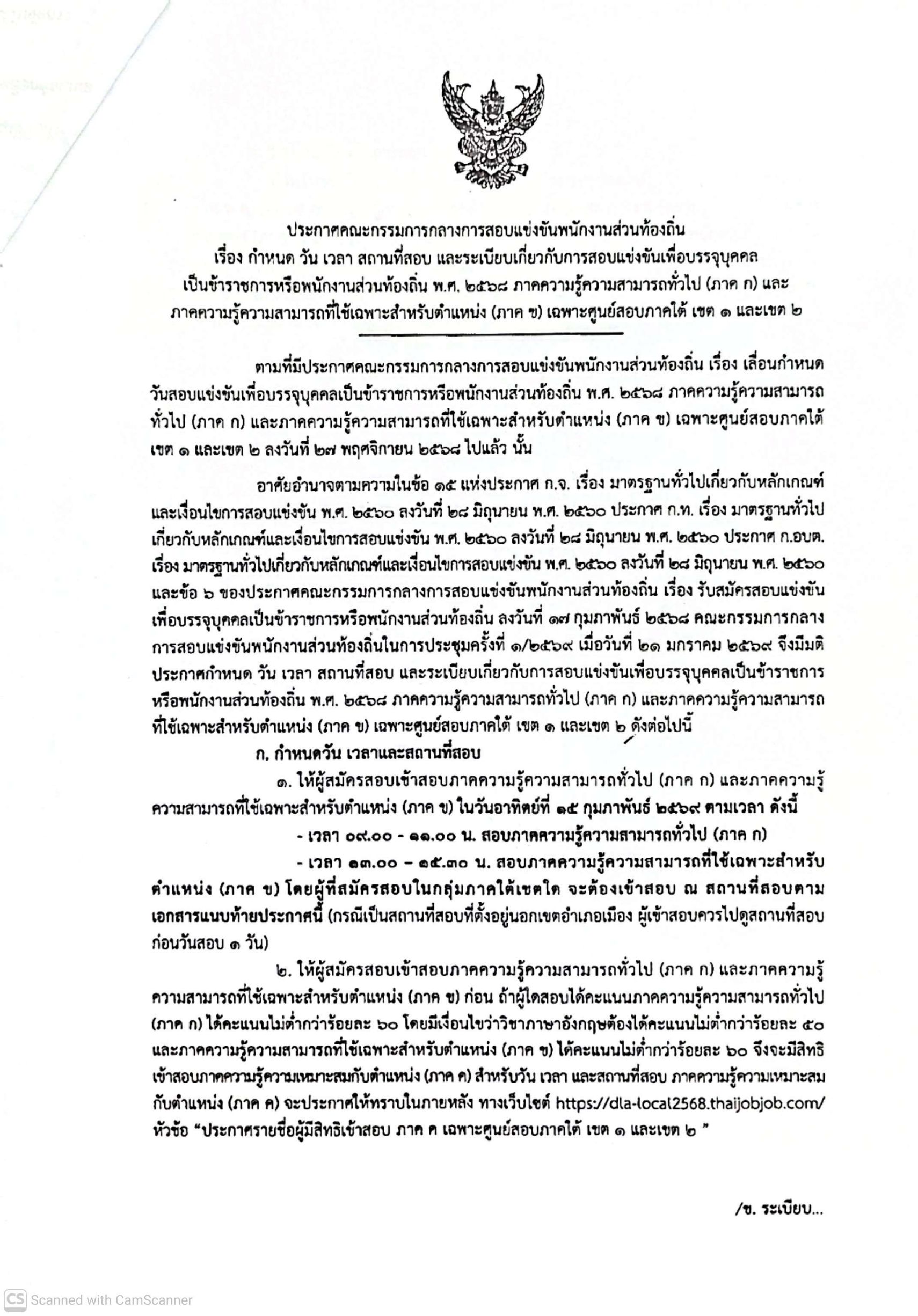 ประกาศคณะกรรมการกลางการสอบแข่งขันพนักงานส่วนส่วนท้องถิ่น เรื่อง กำหนด วัน เวลา สถานที่สอบ และระเบียบเกี่ยวกับการสอบแข่งขันเพื่อบรรจุบุคคล เป็นข้าราชการหรือพนักงานส่วนท้องถิ่น พ.ศ. 2568 ภาคความรู้ความสามารถทั่วไป (ภาค ก) และ ภาคความรู้ความสามารถที่ใช้เฉพาะสำหรับตำแหน่ง (ภาค ข) เฉพาะศูนย์สอบภาคใต้ เขต 1 และเขต 2