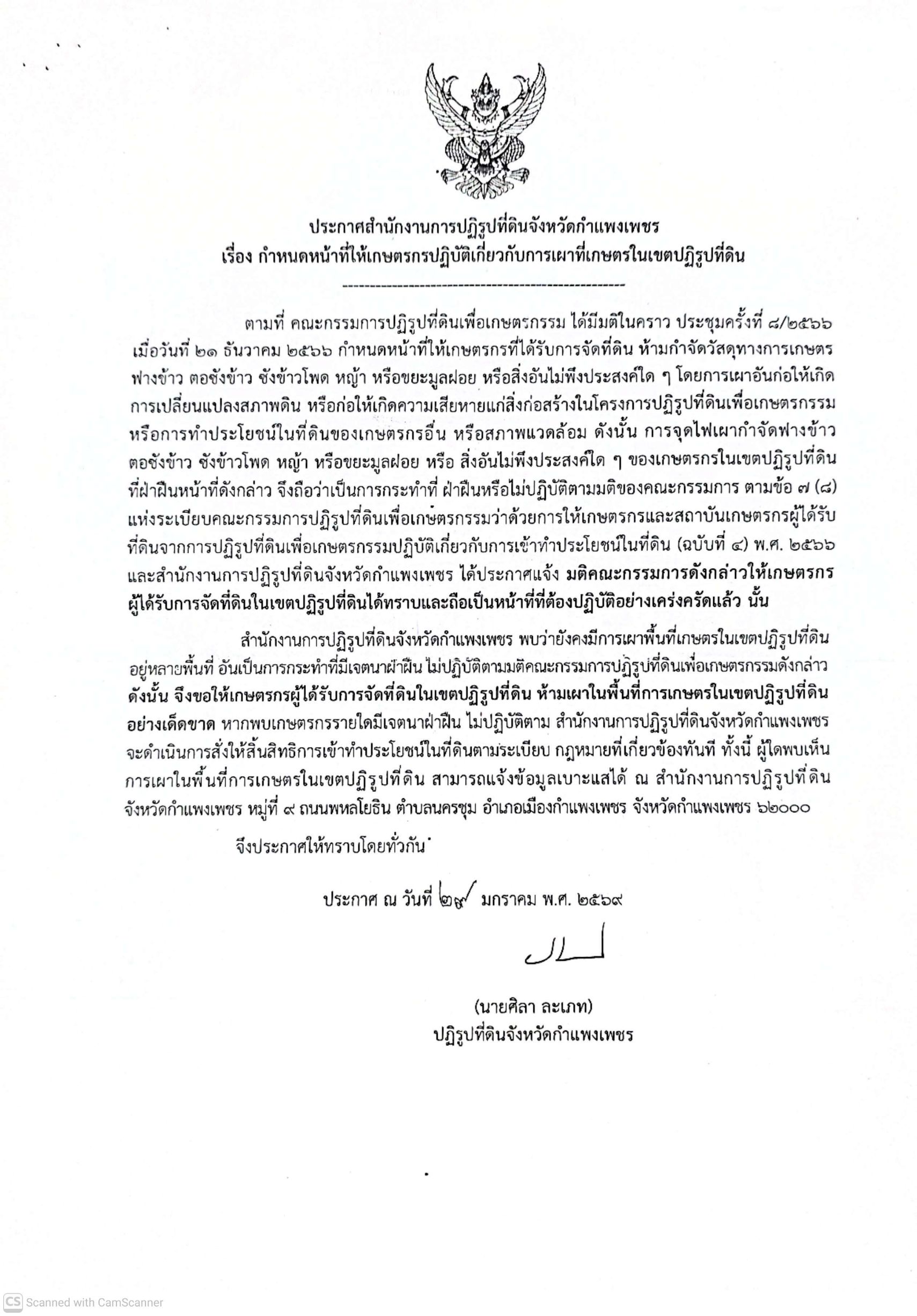 ประกาศสำนักงานการปฏิรูปที่ดินจังหวัดกำแพงเพชร เรื่อง กำหนดหน้าที่ให้เกษตรกรปฏิบัติเกี่ยวกับการเผาที่เกษตรในเขตปฏิรูปที่ดิน
