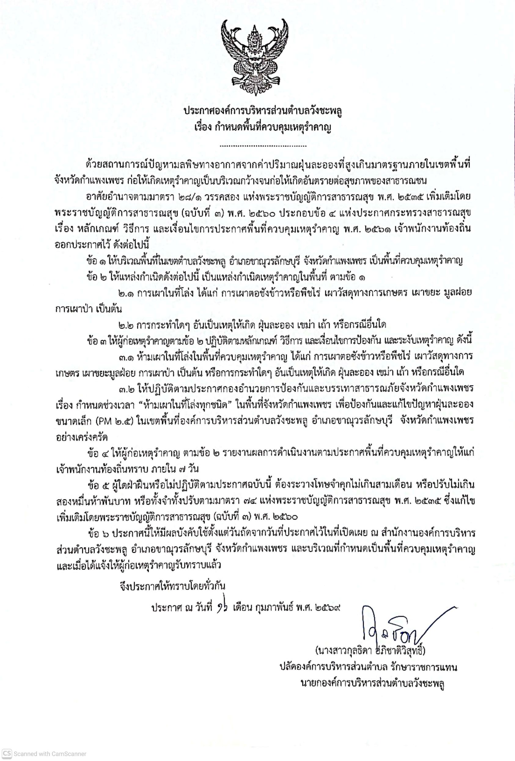 ด้วยสถานการณ์ปัญหามลพิษทางอากาศจากค่าปริมาณฝุ่นละอองที่สูงเกินมาตรฐานภายในเขตพื้นที่จังหวัดกำแพงเพชร ก่อให้เกิดเหตุรำคาญเป็นบริเวณกว้างจนก่อให้เกิดอันตรายต่อสุขภาพของสาธารณชน ห้ามเผาในที่โล่งในพื้นที่ควบคุมเหตุรำคาญ ได้แก่ การเผาตอชังข้าวหรือพืชไร่ เผาวัสดุทางการเกษตร เผาขยะมูลฝอย การเผาป่า เป็นต้น หรือการกระทำใดๆ อันเป็นเหตุให้เกิด ฝุ่นละออง เขม่า เถ้า หรือกรณีอื่นใด ผู้ใดฝ่าฝืนหรือไม่ปฏิบัติตามประกาศฉบับนี้ ต้องระวางโทษจำคุกไม่เกินสามเดือน หรือปรับไม่เกินสองหมื่นห้าพันบาท รายละเอียดตามประกาศ