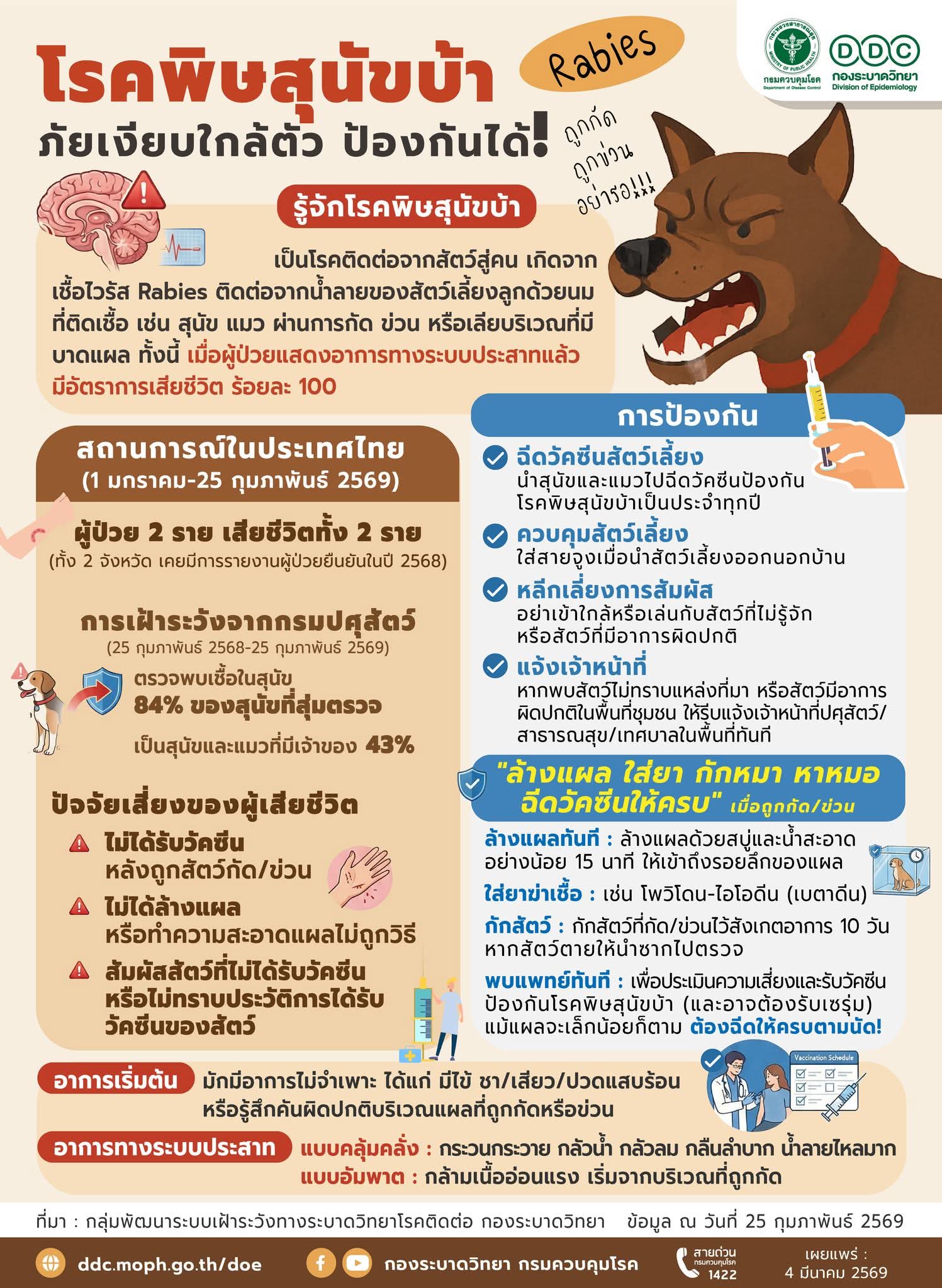 ย้ำเตือน #โรคพิษสุนัขบ้า โรคติดต่อจากสัตว์สู่คน ที่เมื่อผู้ป่วยแสดงอาการทางระบบประสาทแล้ว มีอัตราการเสียชีวิตสูงถึง 100%❗️