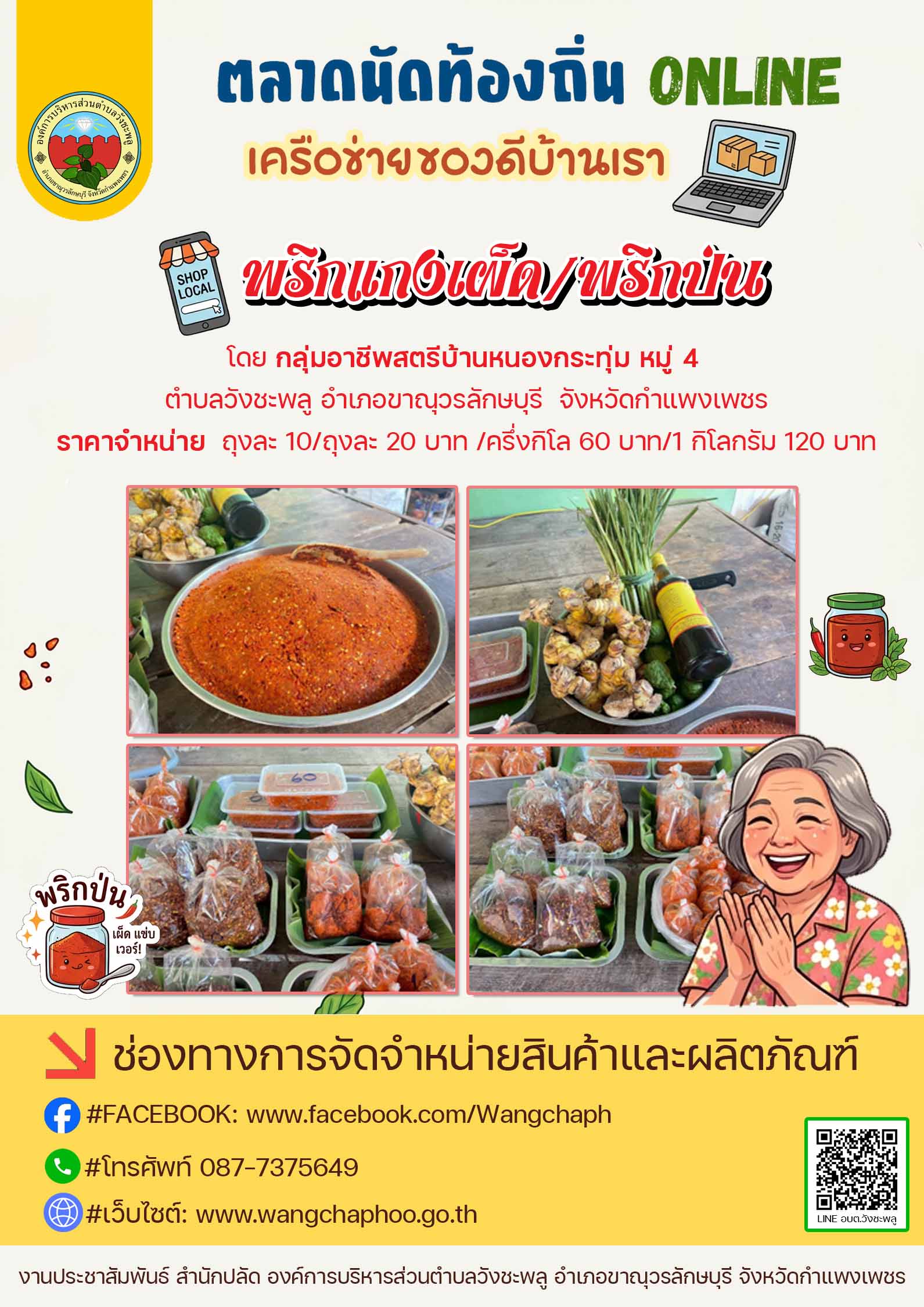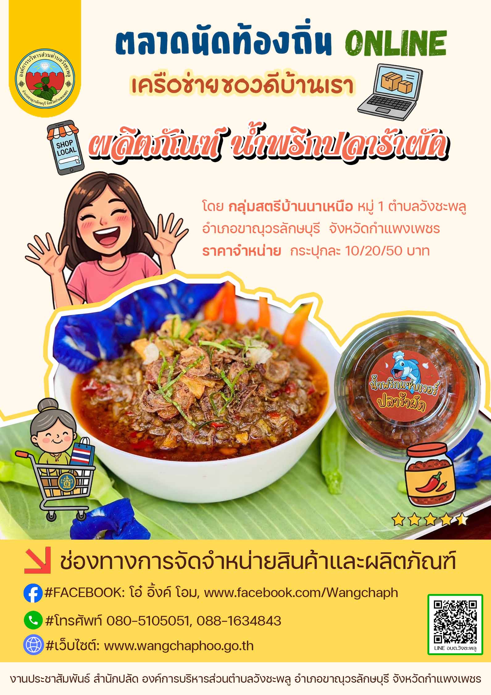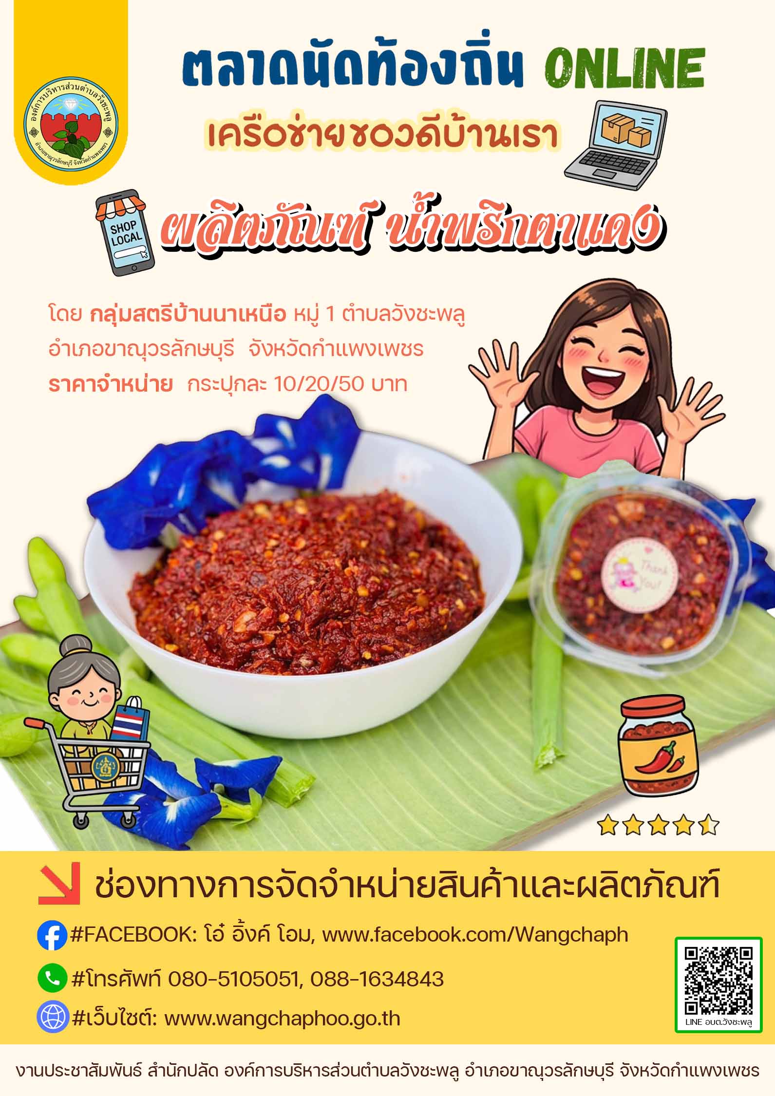 องค์การบริหารส่วนตำบลวังชะพลู ดำเนินการตามแนวทางกิจกรรม “ตลาดนัดท้องถิ่น ONLINE เครือข่ายของดีบ้านเรา” ของกรมส่งเสริมการปกครองท้องถิ่น กระทรวงมหาดไทย เพื่อช่วยเหลือผู้ประกอบการรายย่อยและเกษตรกร ให้สามารถจำหน่ายสินค้าและผลผลิตทางการเกษตรผ่านสื่อสังคมออนไลน์ ⭐️น้ำพริกตาแดง/น้ำพริกผัดหมู/น้ำพริกปลาร้าผัด โดย กลุ่มสตรีบ้านนาเหนือ หมู่ 1 ⭐️น้ำพริกกล้วยไข่/ลาบกล้วยไข่ โดย กลุ่มอาชีพสตรีเกษตรปลอดสารบ้านสองหนอง หมู่ 19 ⭐️พริกแกงเผ็ด/พริกป่น โดย กลุ่มอาชีพสตรีบ้านหนองกระทุ่ม หมู่ 14