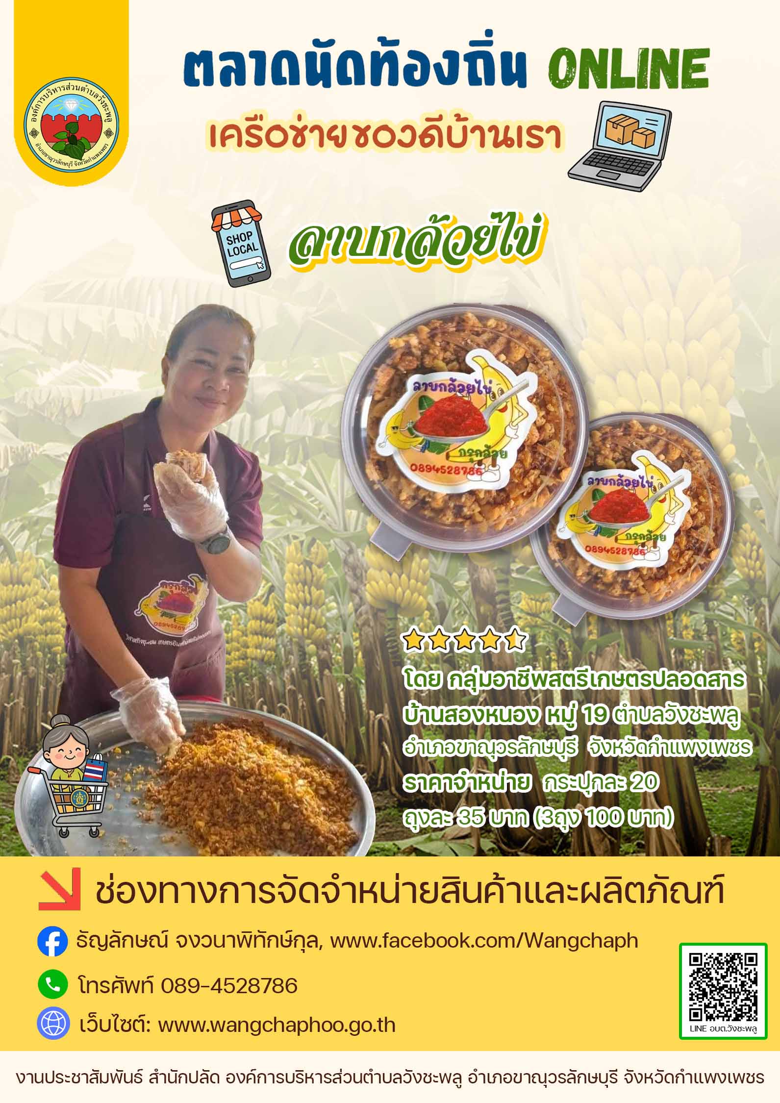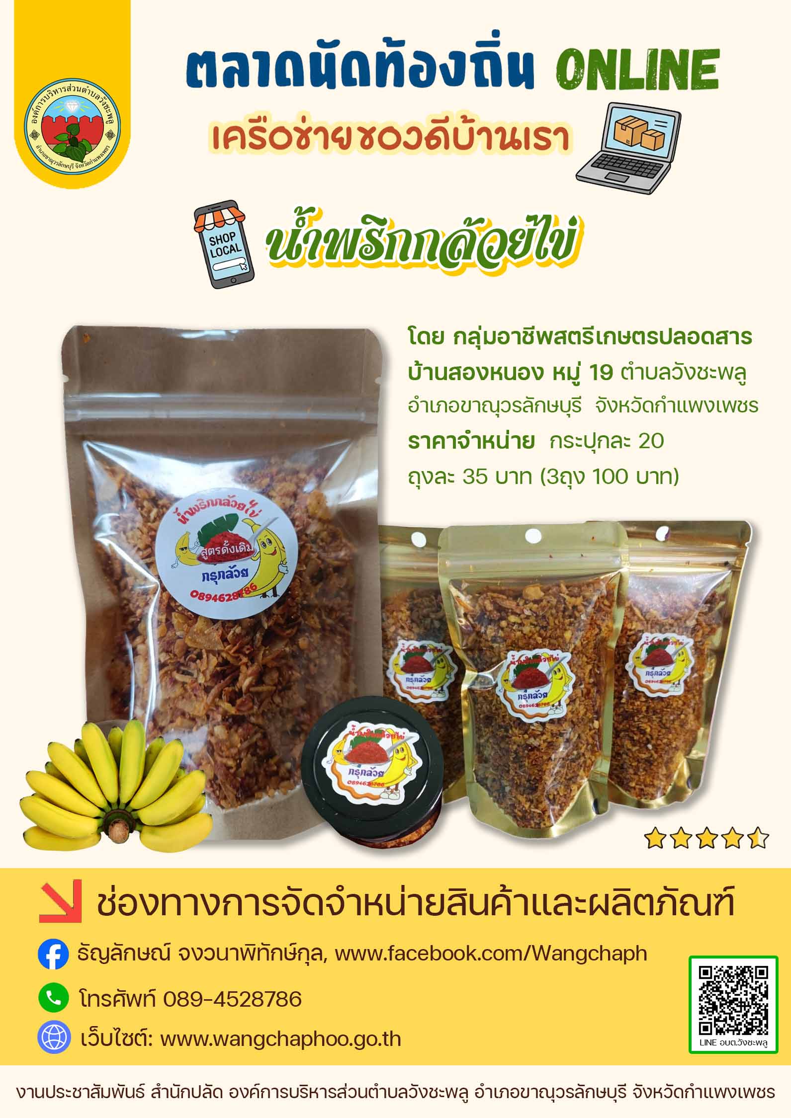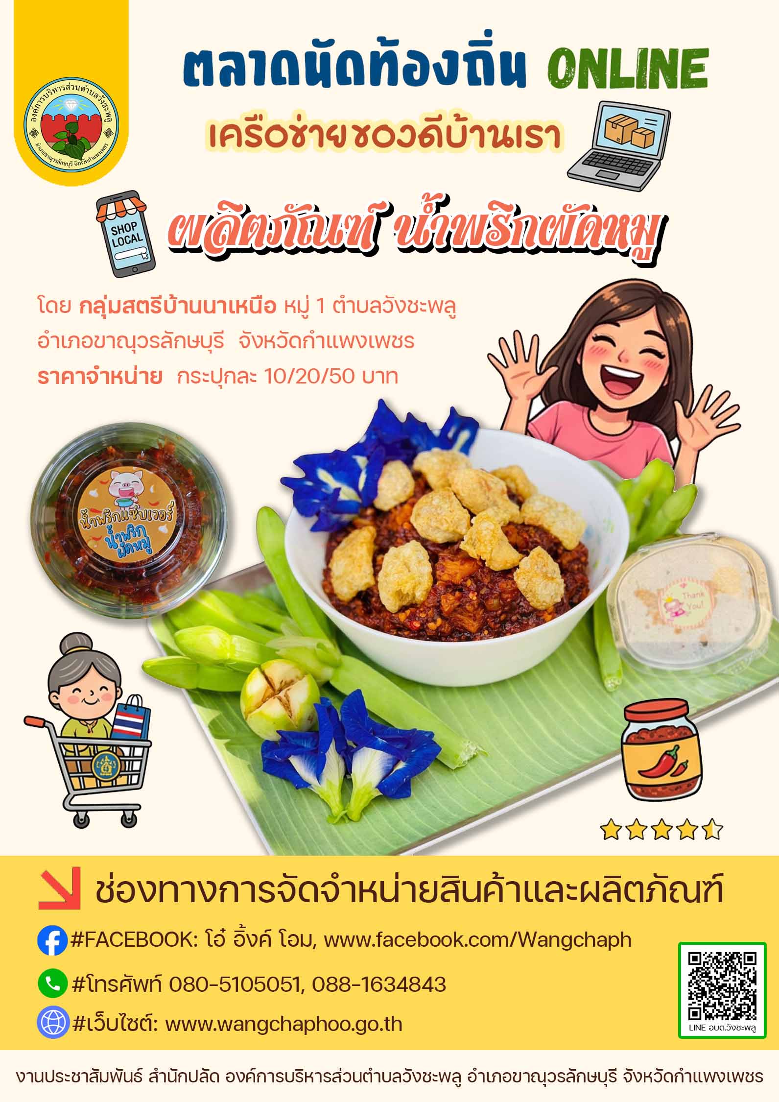องค์การบริหารส่วนตำบลวังชะพลู ดำเนินการตามแนวทางกิจกรรม “ตลาดนัดท้องถิ่น ONLINE เครือข่ายของดีบ้านเรา” ของกรมส่งเสริมการปกครองท้องถิ่น กระทรวงมหาดไทย เพื่อช่วยเหลือผู้ประกอบการรายย่อยและเกษตรกร ให้สามารถจำหน่ายสินค้าและผลผลิตทางการเกษตรผ่านสื่อสังคมออนไลน์ ⭐️น้ำพริกตาแดง/น้ำพริกผัดหมู/น้ำพริกปลาร้าผัด โดย กลุ่มสตรีบ้านนาเหนือ หมู่ 1 ⭐️น้ำพริกกล้วยไข่/ลาบกล้วยไข่ โดย กลุ่มอาชีพสตรีเกษตรปลอดสารบ้านสองหนอง หมู่ 19 ⭐️พริกแกงเผ็ด/พริกป่น โดย กลุ่มอาชีพสตรีบ้านหนองกระทุ่ม หมู่ 14