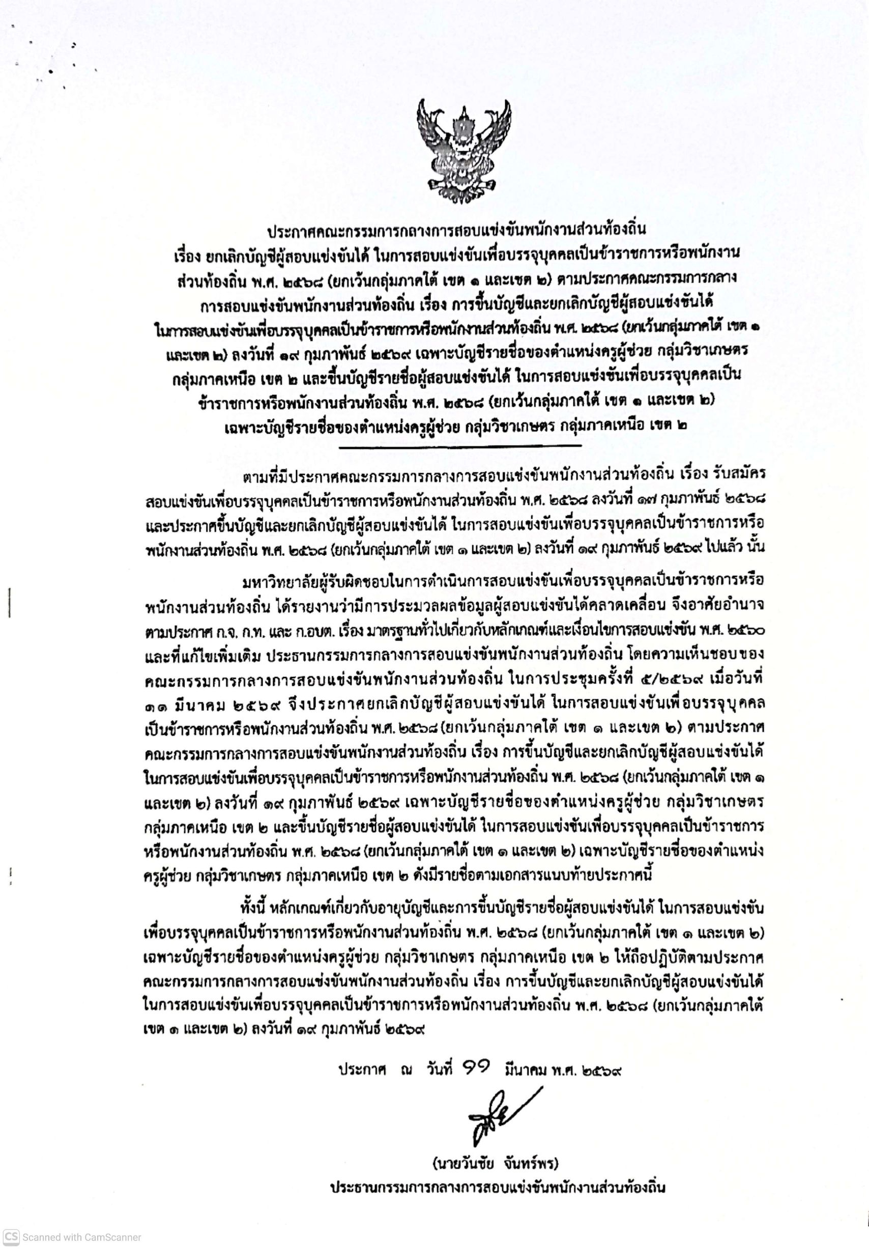 ประกาศคณะกรรมการกลางการสอบแข่งขันพนักงานส่วนท้องถิ่น เรื่อง ยกเลิกบัญชีผู้สอบแข่งขันได้ ในการสอบแข่งขันเพื่อบรรจุบุคคลเป็นข้าราชการหรือพนักงานส่วนท้องถิ่น พ.ศ. 2568 (ยกเว้นกลุ่มภาคใต้ เขต 1 และเขต 2) ตามประกาศคณะกรรมการกลางการสอบแข่งขันพนักงานส่วนท้องถิ่น เรื่อง การขึ้นบัญชีและยกเลิกบัญชีผู้สอบแข่งชันได้ ในการสอบแข่งขันเพื่อบรรจุบุคคลเป็นข้าราชการหรือพนักงานส่วนท้องถิ่น พ.ศ. 2568 (ยกเว้นกลุ่มภาคใต้เขต 1และเขต 2) ลงวันที่ 19 กุมภาพันธ์ 2569 เฉพาะบัญชีรายชื่อของตำแหน่งครูผู้ช่วย กลุ่มวิชาเกษตร กลุ่มภาคเหนือ เขต 2 และขึ้นบัญชีรายชื่อผู้สอบแข่งขันได้ ในการสอบแข่งขันเพื่อบรรจุบุคคลเป็นข้าราชการหรือพนักงานส่วนท้องถิ่น พ.ศ. 2568 (ยกเว้นกลุ่มภาคใต้ เขต 1 และเขต 2) เฉพาะบัญชีรายชื่อของตำแหน่งครูผู้ช่วย กลุ่มวิชาเกษตร กลุ่มภาคเหนือ เขต 2