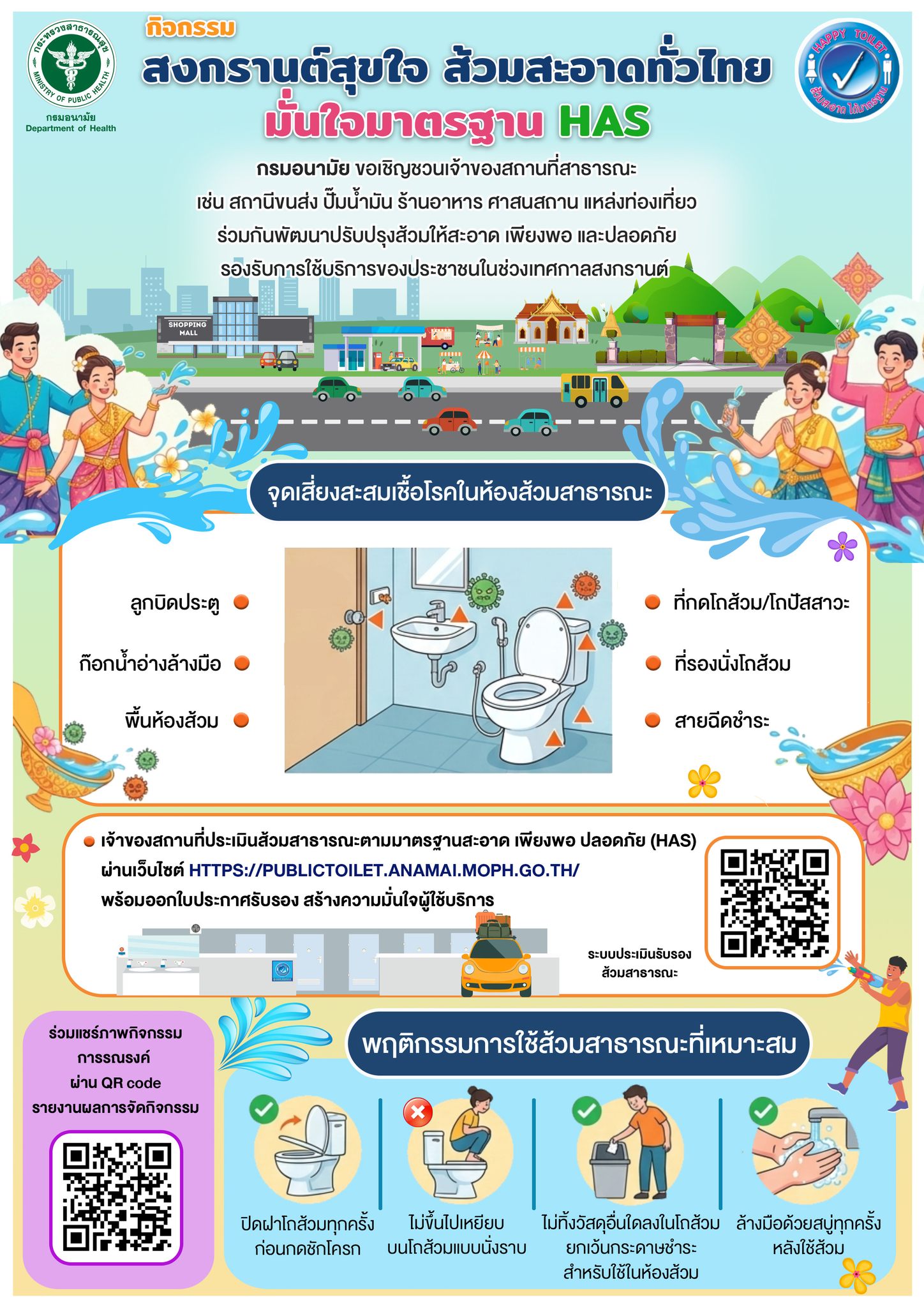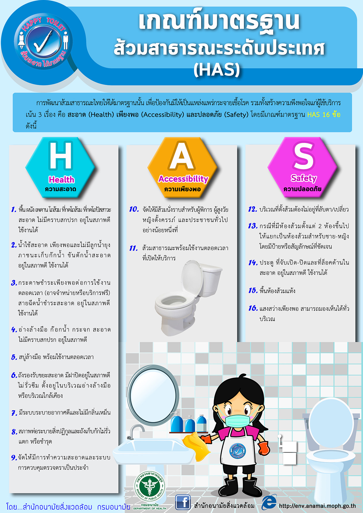 - ทำความสะอาด ปรับปรุงส้วมให้ได้ตามมาตรฐาน HAS (H: HEALTH, A: ACCESSIBILITY, S: SAFETY) เลือกใช้น้ำยาทำความสะอาดที่มีประสิทธิภาพ ???????? พร้อมทั้งเพิ่มความถี่ในการทำความสะอาดจุดเสี่ยง สะสมเชื้อโรคในห้องส้วม