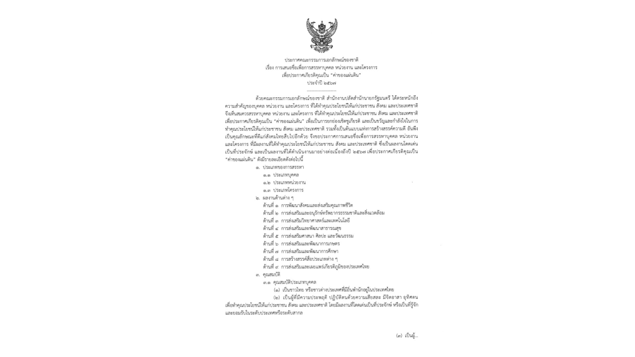 ขอเชิญชวนเสนอชื่อเพื่อการสรรหาบุคคล หน่วยงาน และโครงการ เพื่อประกาศเกียรติคุณเป็น "ค่าของแผ่นดิน" ประจำปี 2567