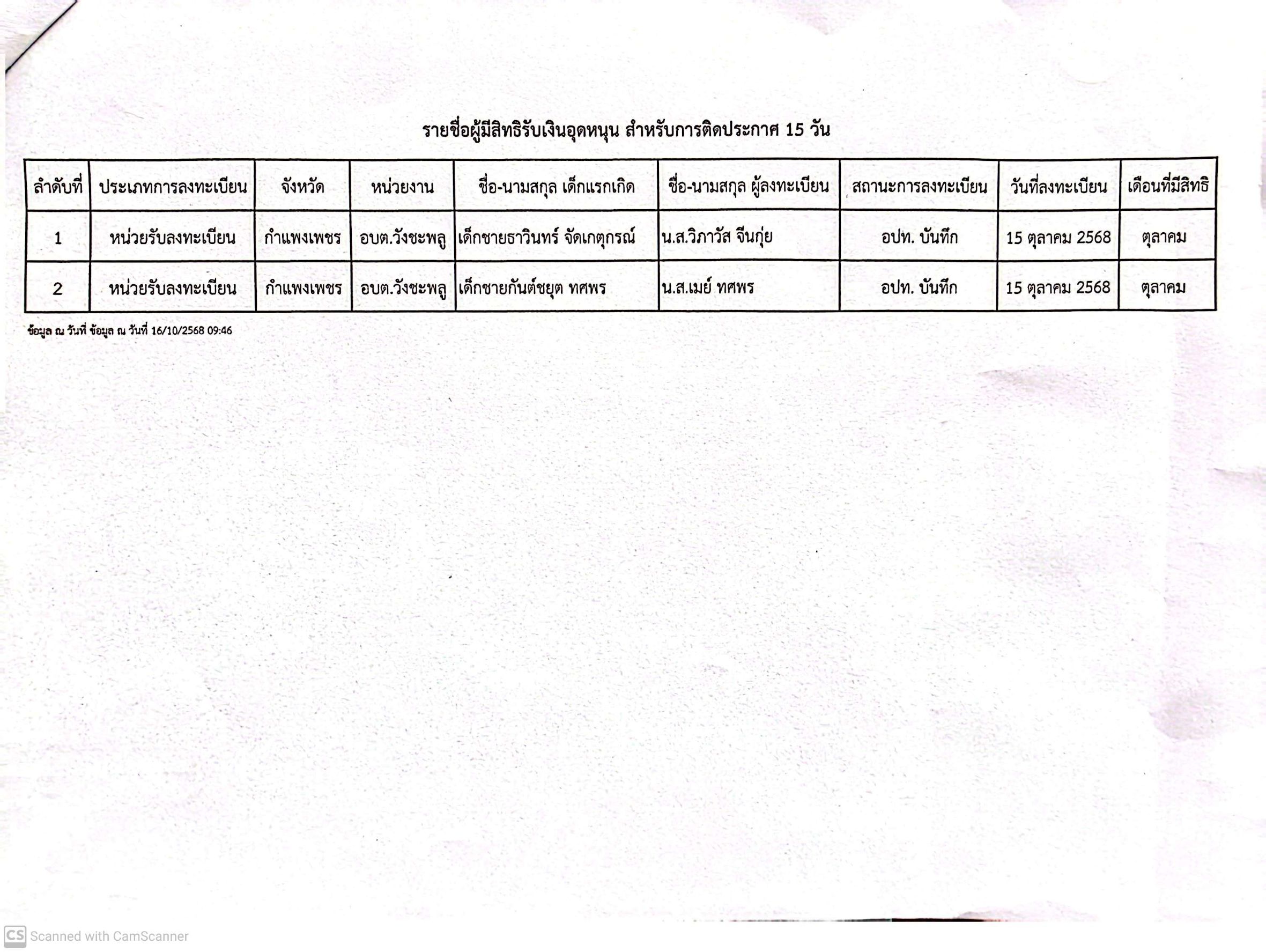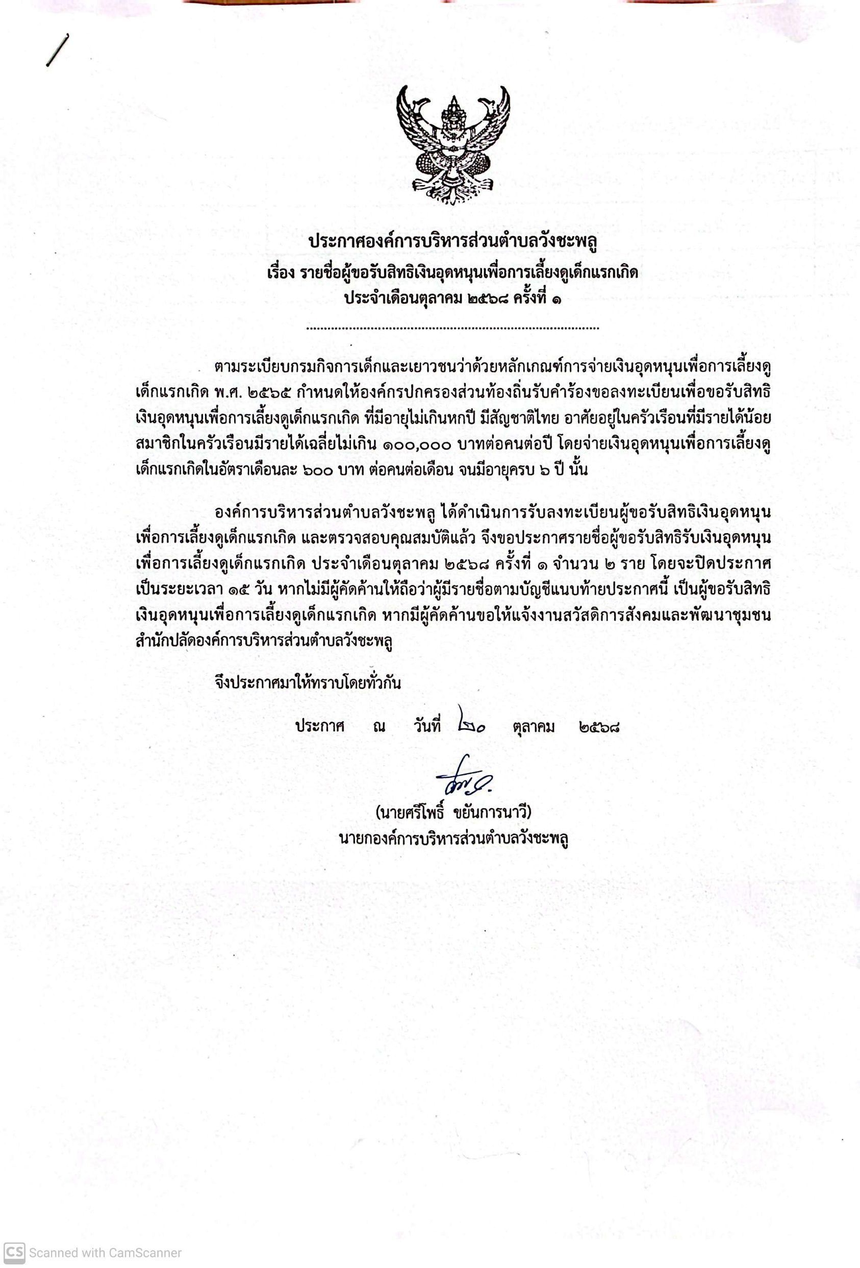 ประกาศองค์การบริหารส่วนตำบลวังชะพลู เรื่อง รายชื่อผู้ขอรับสิทธิเงินอุดหนุนเพื่อการเลี้ยงดูเด็กแรกเกิด ประจำเดือนตุลาคม 2568 ครั้งที่ 1